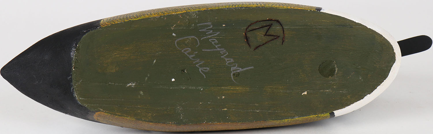Hooded Merganser by Maynard Caine, Ontario, Canada, glass eyes, solid wood, structurally excellent, branded M on bottom, original paint, comb painting on side. Grade: MINT - Value: 30 to 60