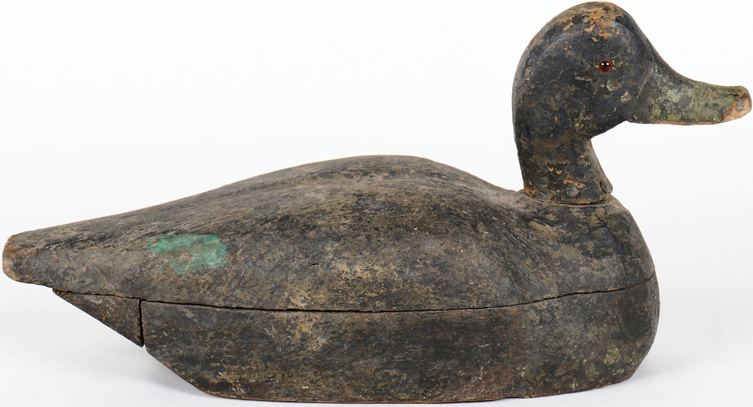 Black Duck by unknown maker, glass eyes, solid wood, head is loose, has age crack around body, original paint. Grade: Very Good - Value: 20 to 60