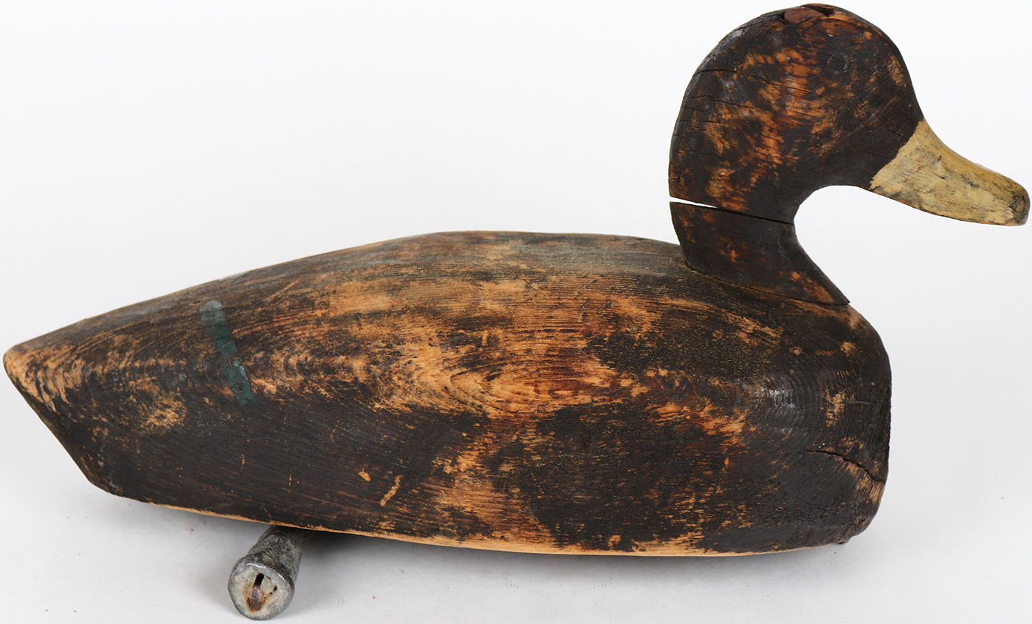 Black Duck by unknown maker, painted eyes, solid wood, neck is loose and cracked, original paint. Grade: Very Good + - Value: 10 to 20