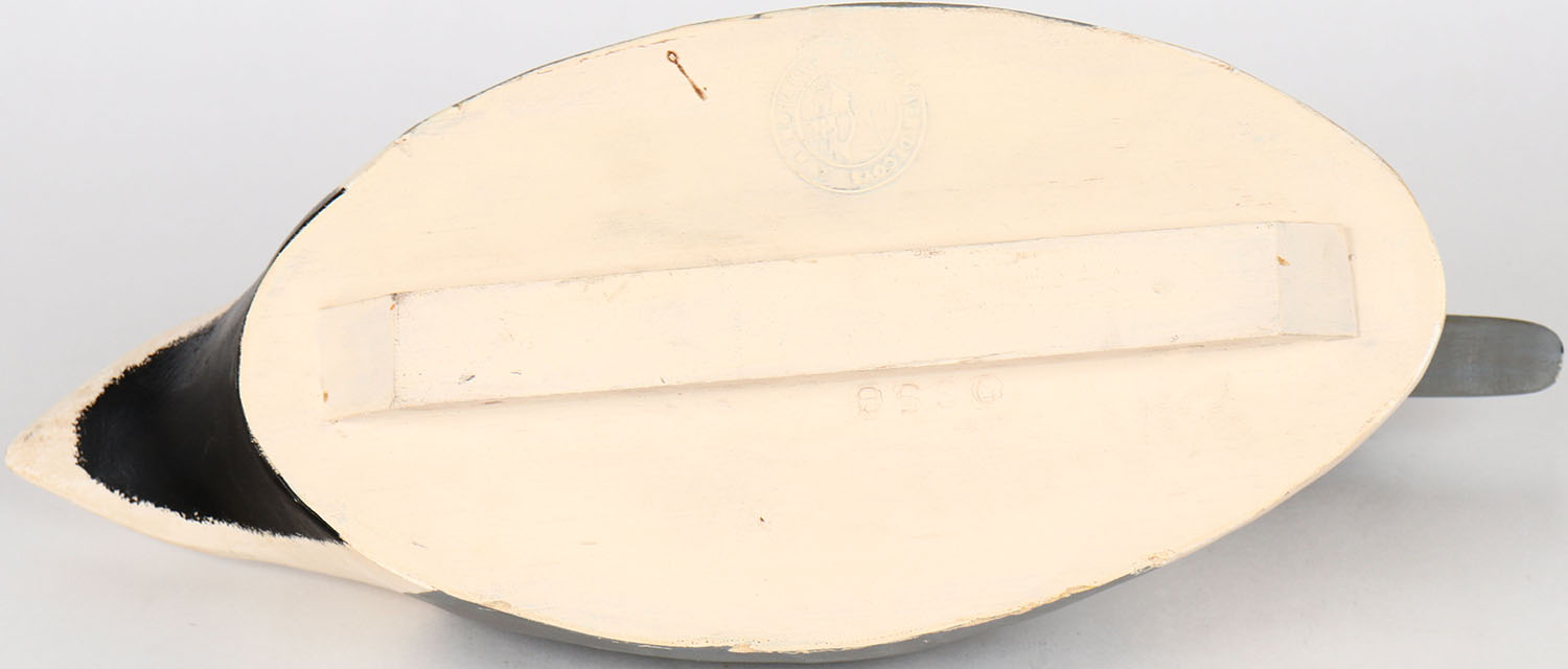 Pintail Drake by Wildfowler Decoys, Babylon, N.Y. glass eyes, hollow wood, structurally excellent, branded on bottom, original paint. Grade: MINT - Value: 50 to 150