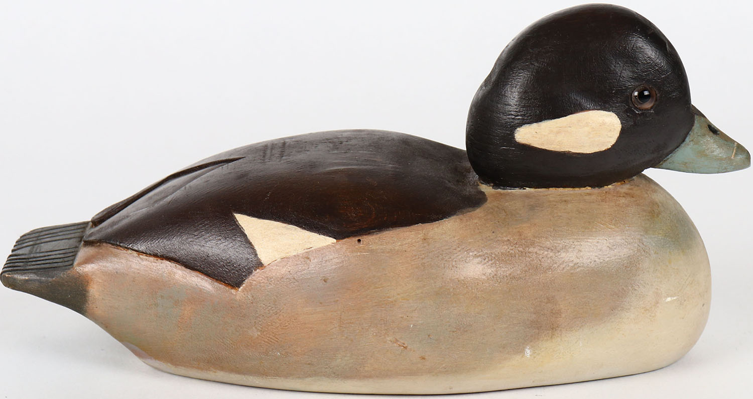 Bufflehead Hen by G. Pratt, glass eyes, solid wood, structurally excellent, signed and branded G. PRATT on bottom, original paint. Grade: MINT - Value: 70 to 150