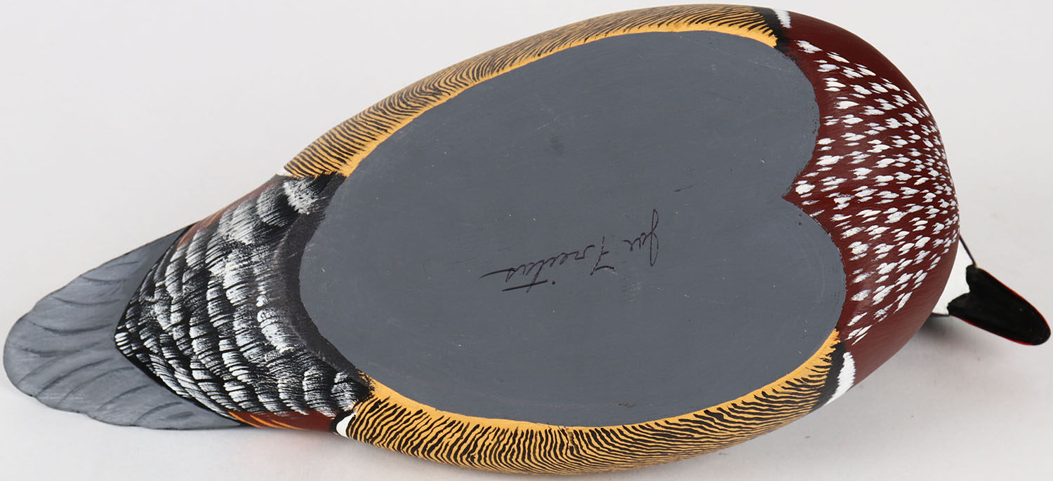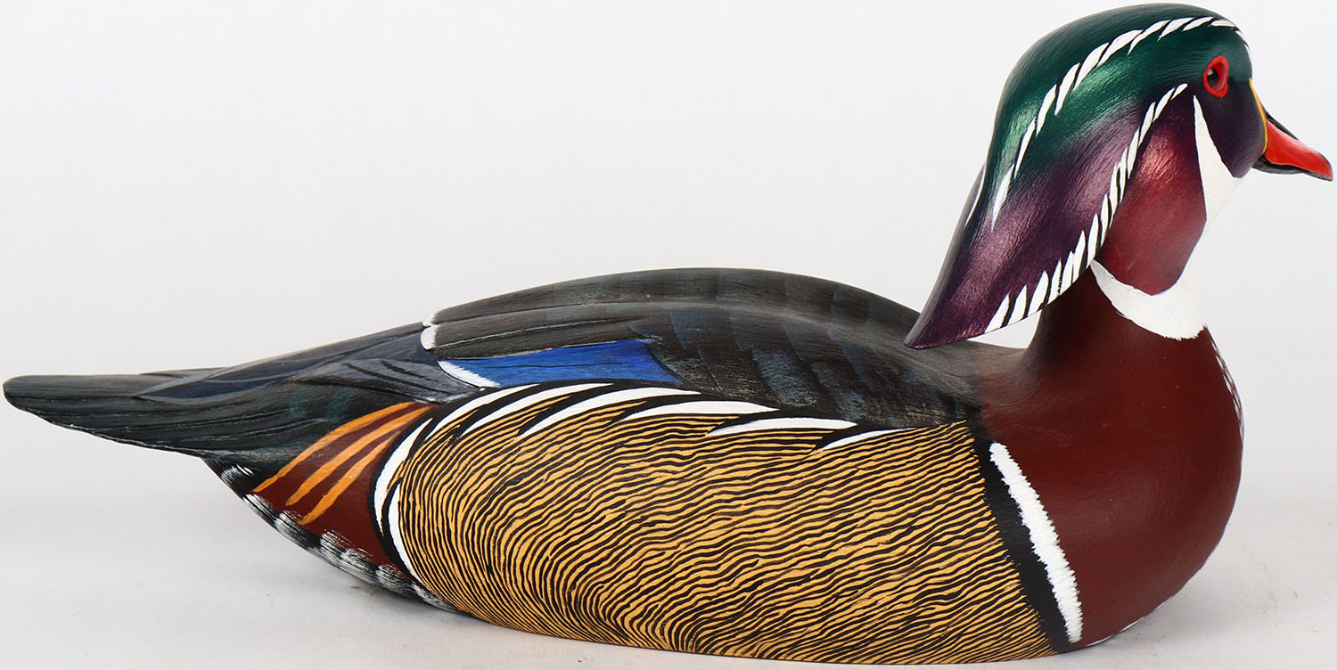 Wood Duck Drake by Joe Freitas, glass eyes, solid wood, structurally excellent, signed on bottom, original paint. Grade: MINT - Value: 100 to 200