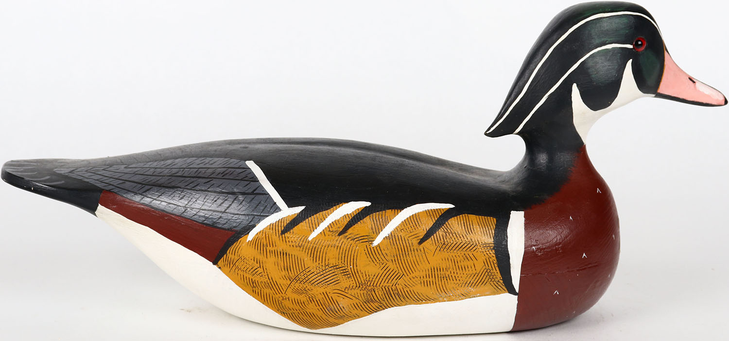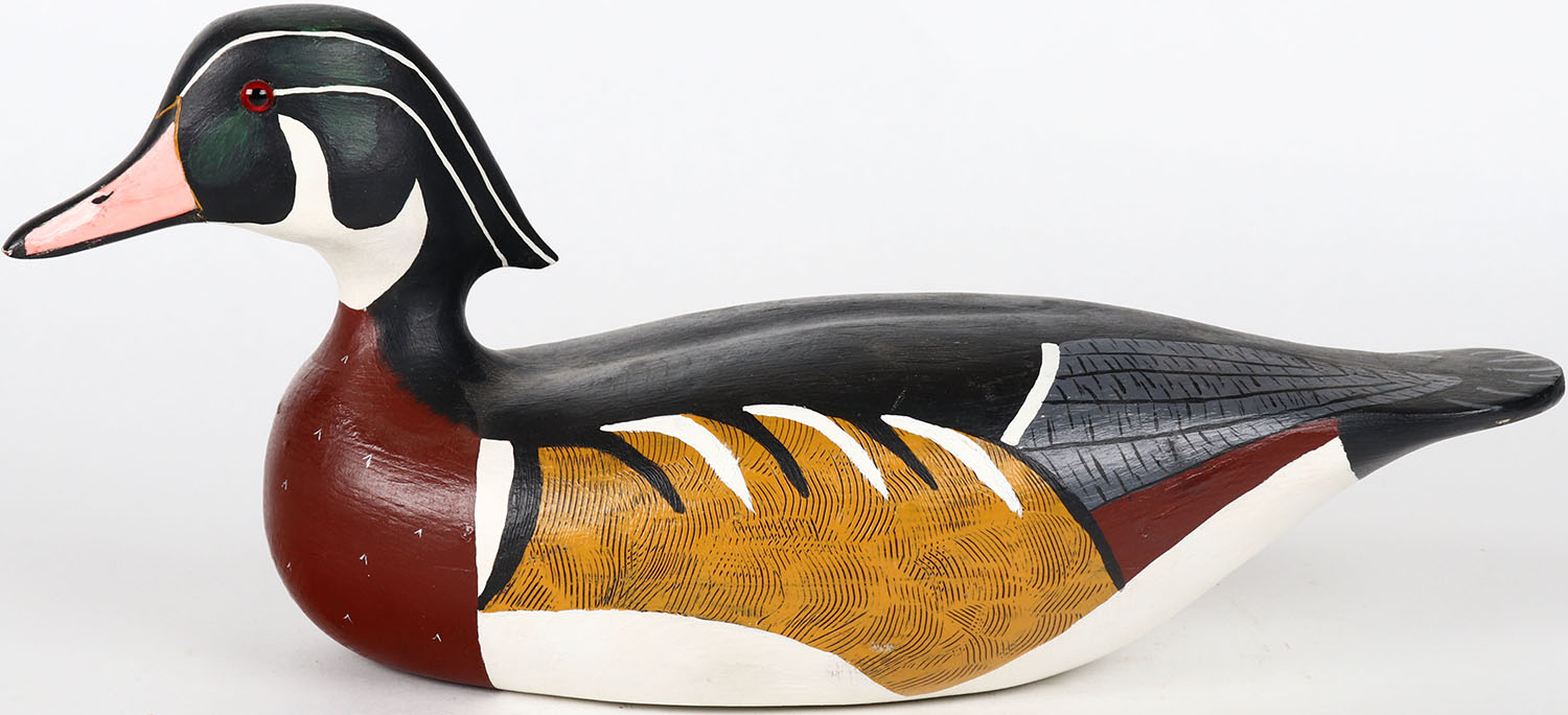 Wood Duck Drake by A.J. Birdsall. Birdsall Decoys, Point Pleasant, New Jersey, glass eyes, hollow wood, structurally excellent, signed on bottom, original paint. Grade: MINT - Value: 100 to 200