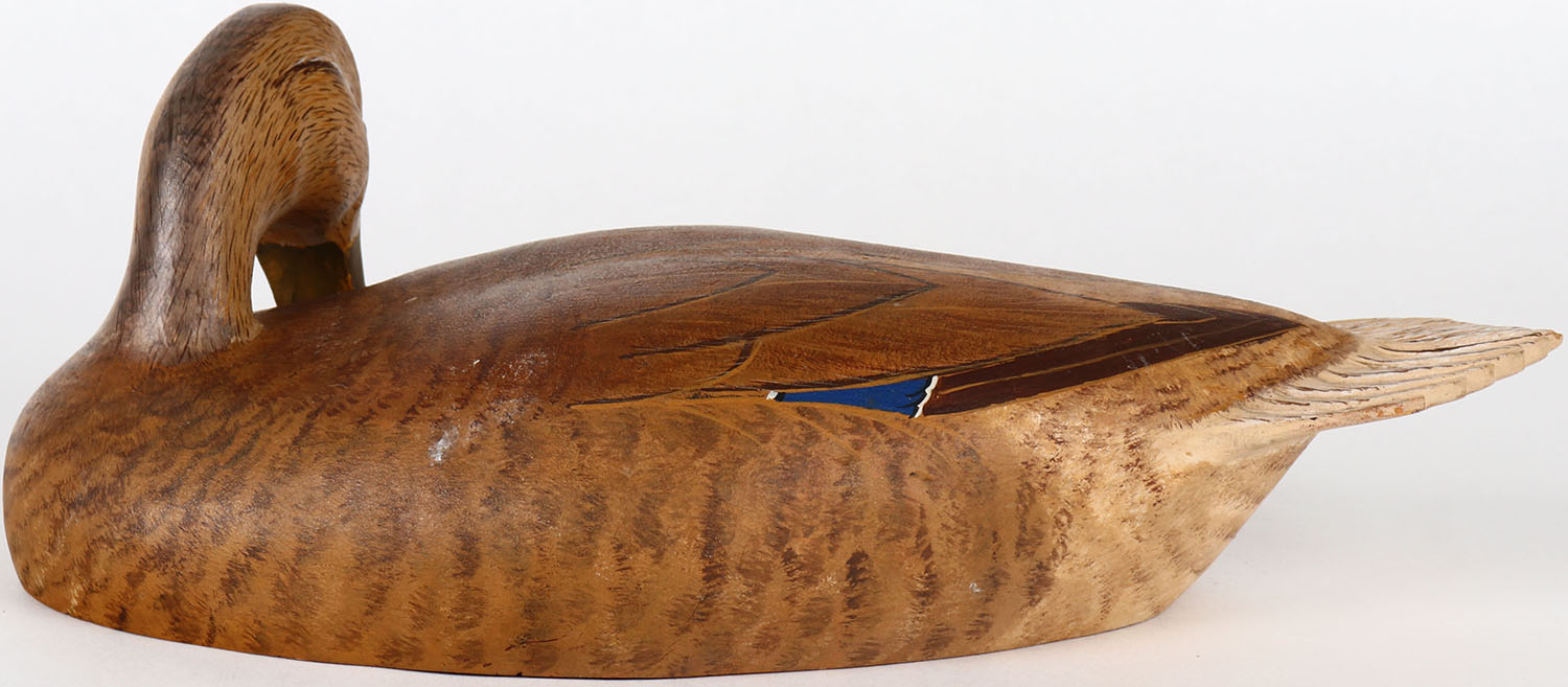 Preening Mallard Hen by Bud and Kevin Hammell, Stony Hill Stool Ducks, Point Pleasant, N.J. glass eyes, solid wood, structurally excellent, signed and branded on bottom, original paint. Grade: MINT - Value: 50 to 100