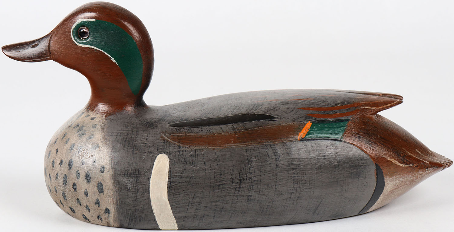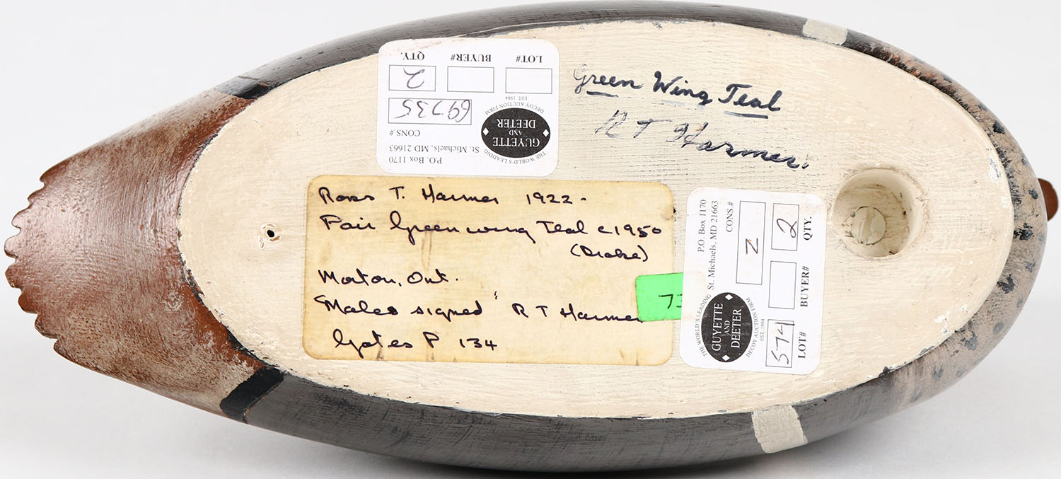 Green Wing Teal Drake by RT Harman, Morton, ONT, glass eyes, solid wood, structurally excellent, signed on bottom, original paint. Grade: MINT - Value: 150 to 300