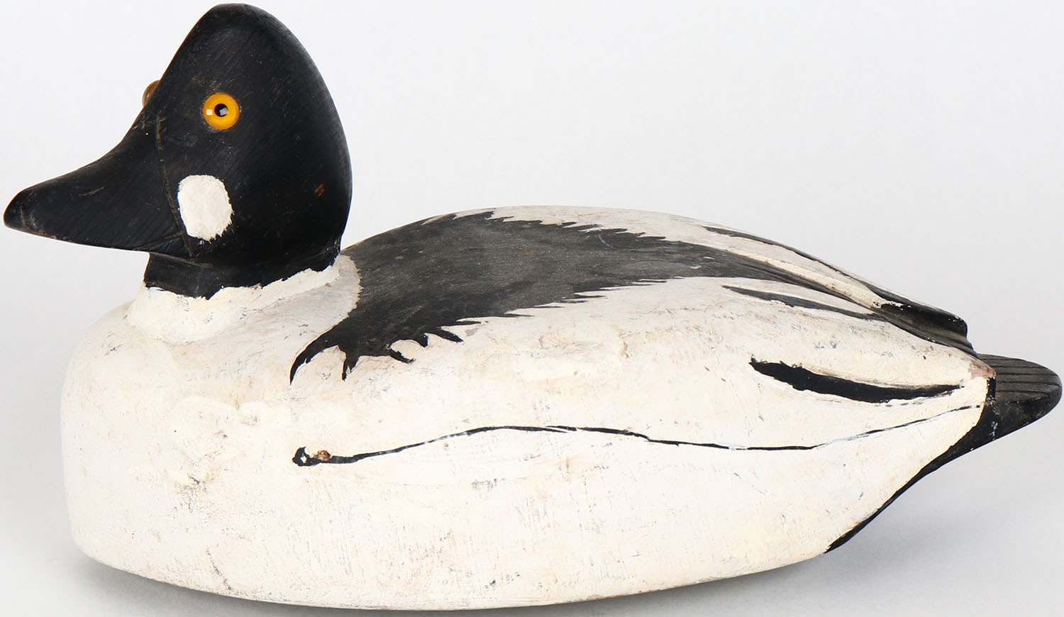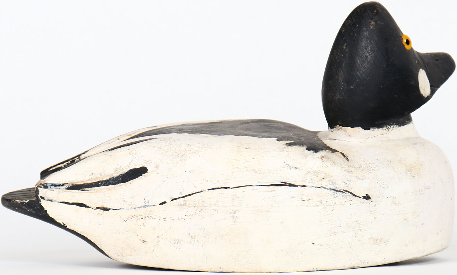 Goldeneye Drake by Dudley Shouler, Gananoque, ONT, glass eyes, solid wood, structurally excellent, signed on bottom, original paint. Grade: Excellent ++ - Value: 40 to 80