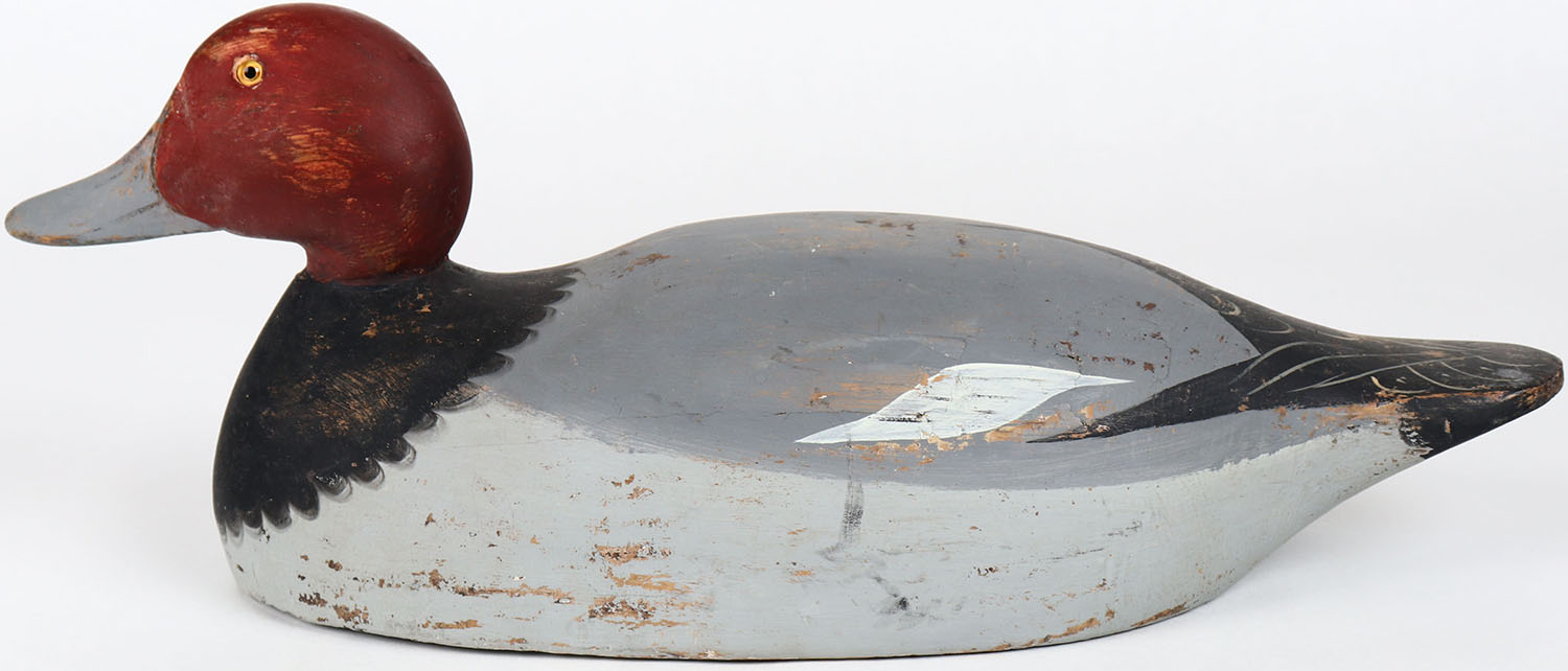 Redhead Drake by Mason Decoy Factory Backbay, glass eyes, solid wood, structurally excellent, original paint. Grade: Excellent - Value: 30 to 150