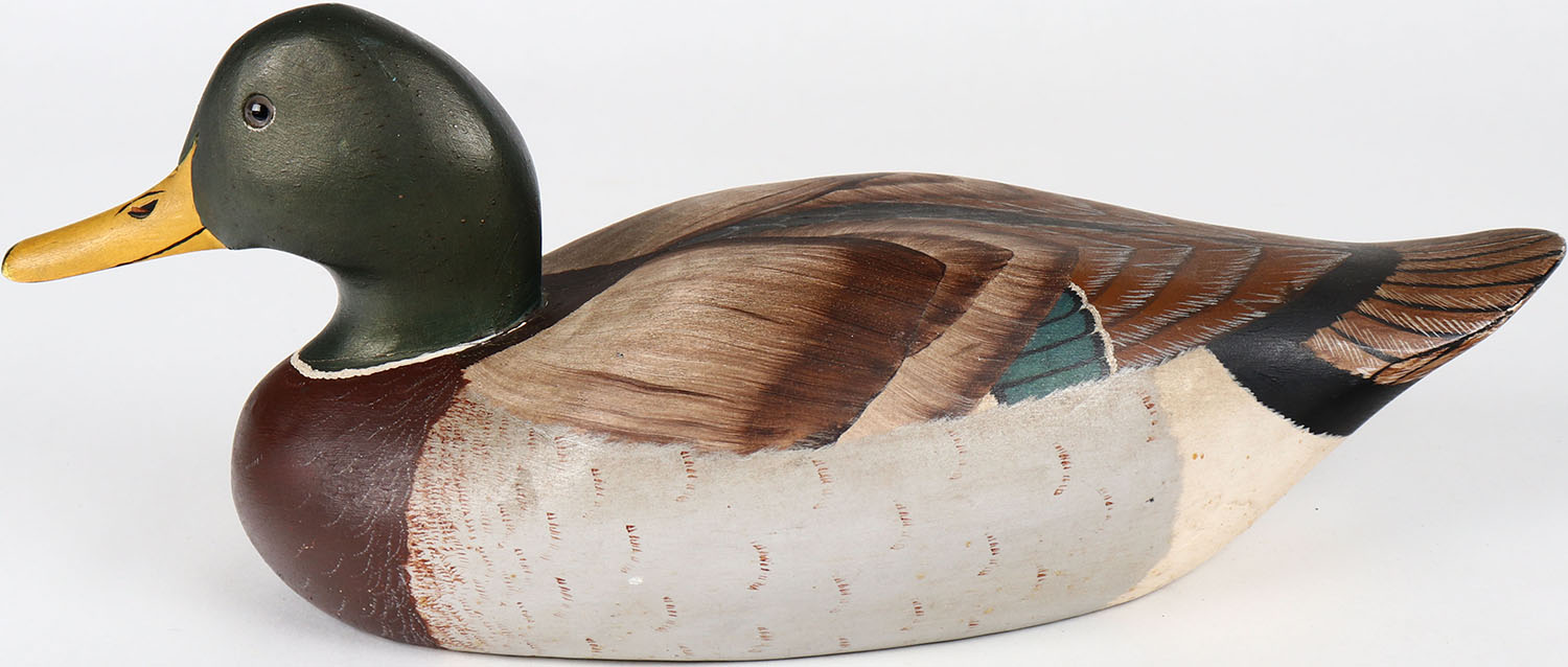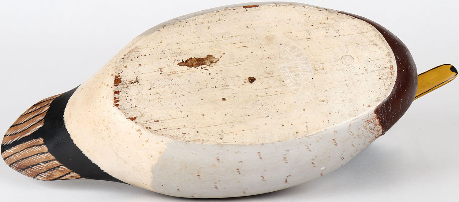 Mallard Drake by unknown maker, Glen Burnie MD. glass eyes, solid wood, structurally excellent, branded on bottom, original paint. Grade: MINT - Value: 40 to 80