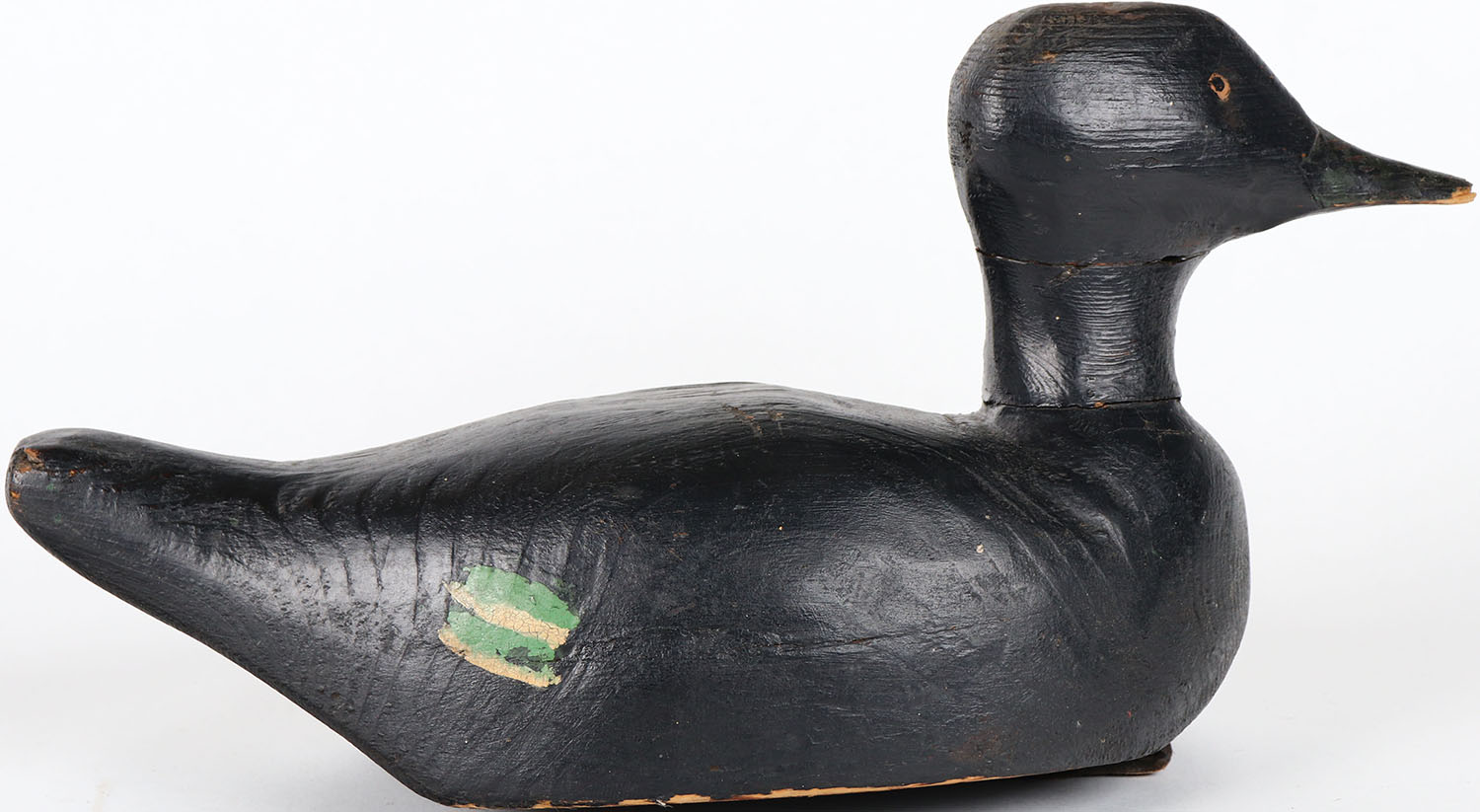 Whitewing Scoter by unknown maker, glass eyes, solid wood, has age crack on bottom, bill is chipped, original paint. Grade: Very Good ++ - Value: 40 to 80