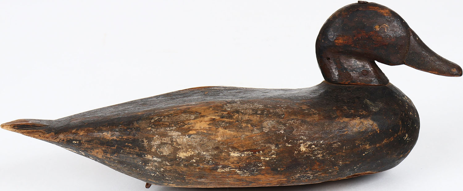 Bluebill Drake by unknown maker, glass eyes, solid wood, head is loose, original paint. Grade: Very Good - Value: 30 to 60