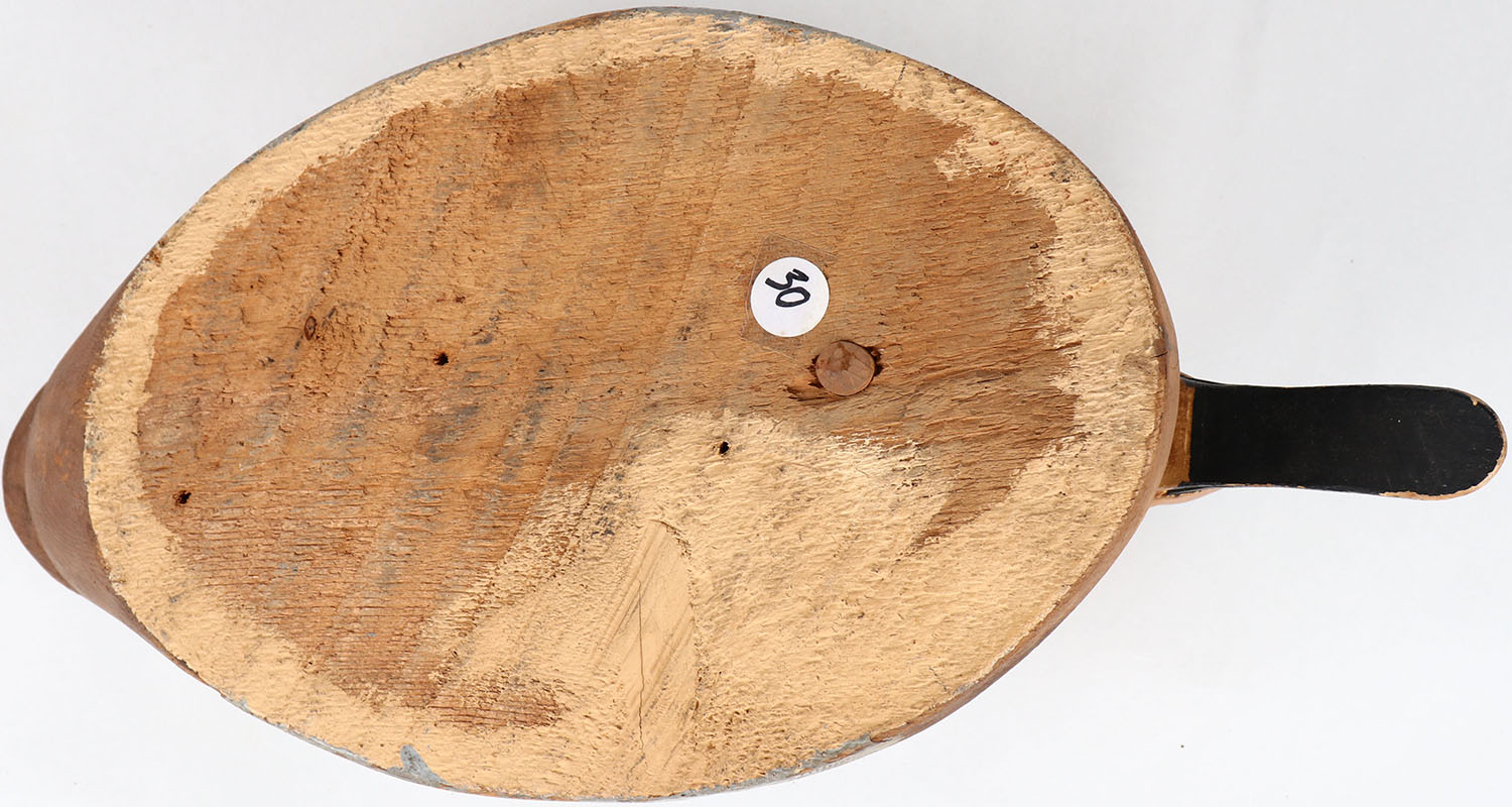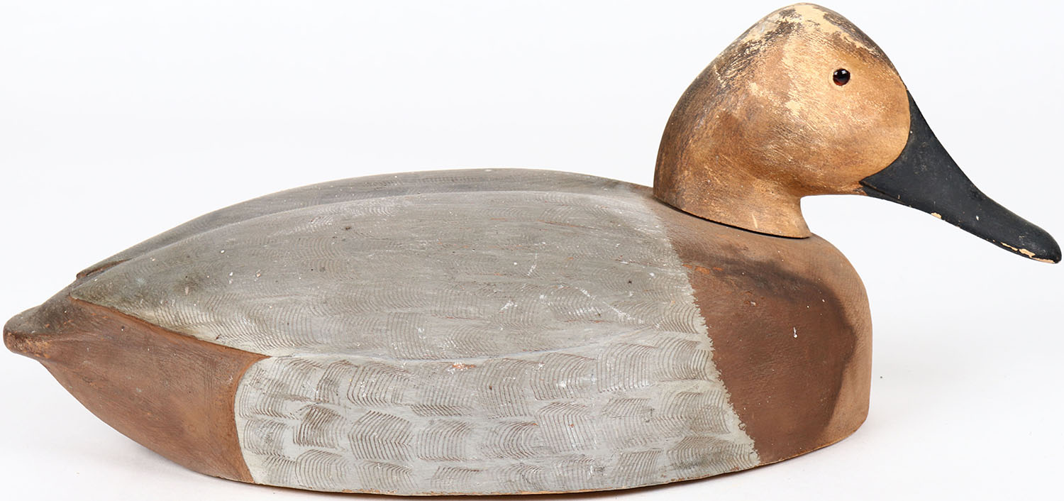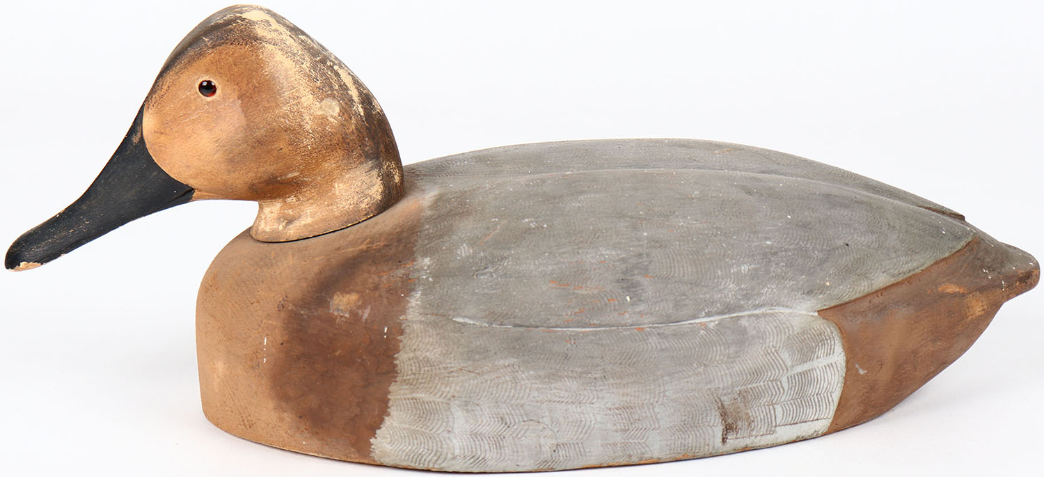 Canvasback Hen by unknown maker, tack eyes, solid wood, has age crack under head, original paint. Grade: Very Good ++ - Value: 40 to 80