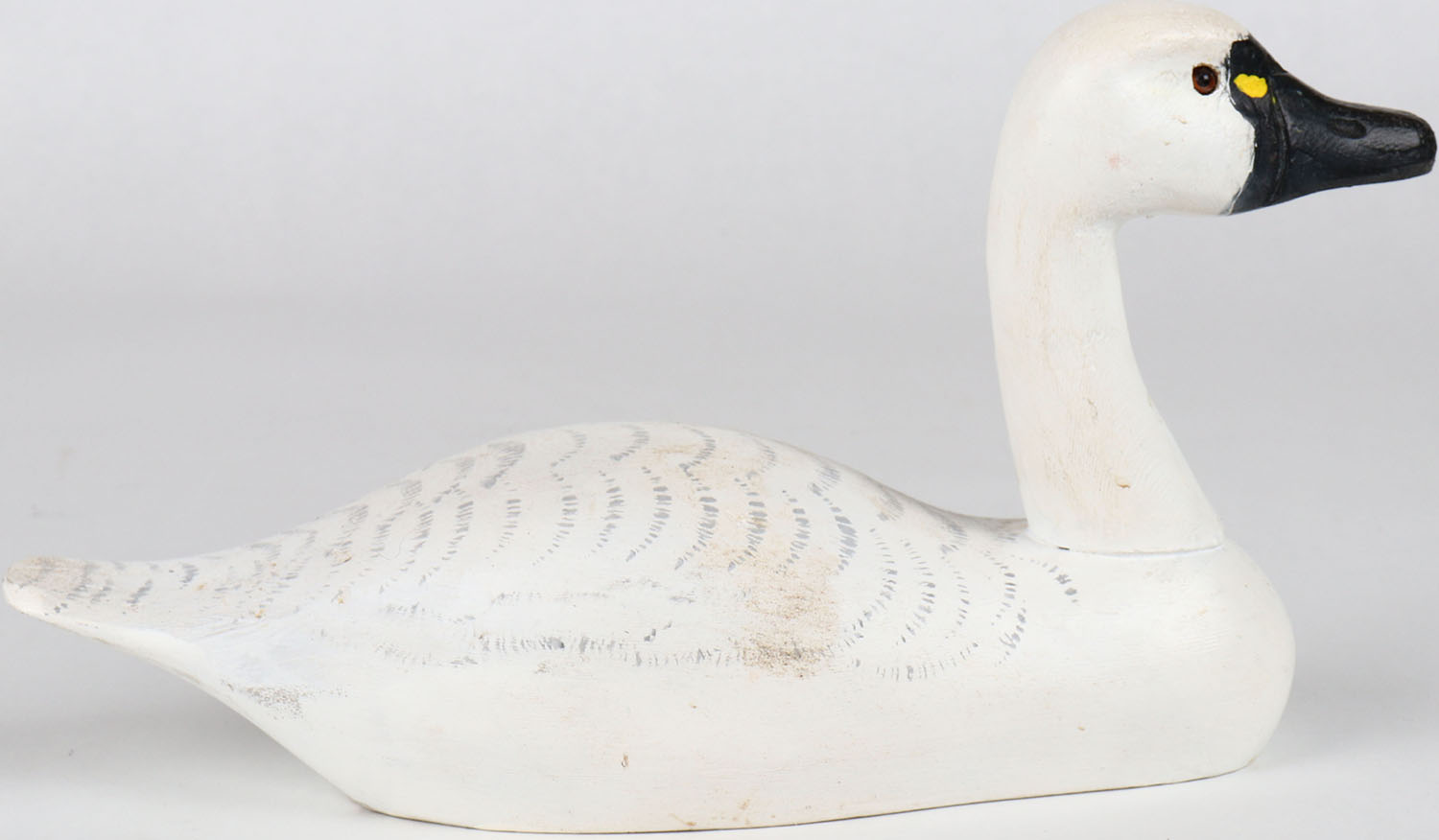 Miniature Swan by unknown maker, glass eyes, solid wood, structurally excellent, original paint. Grade: MINT - Value: 30 to 60