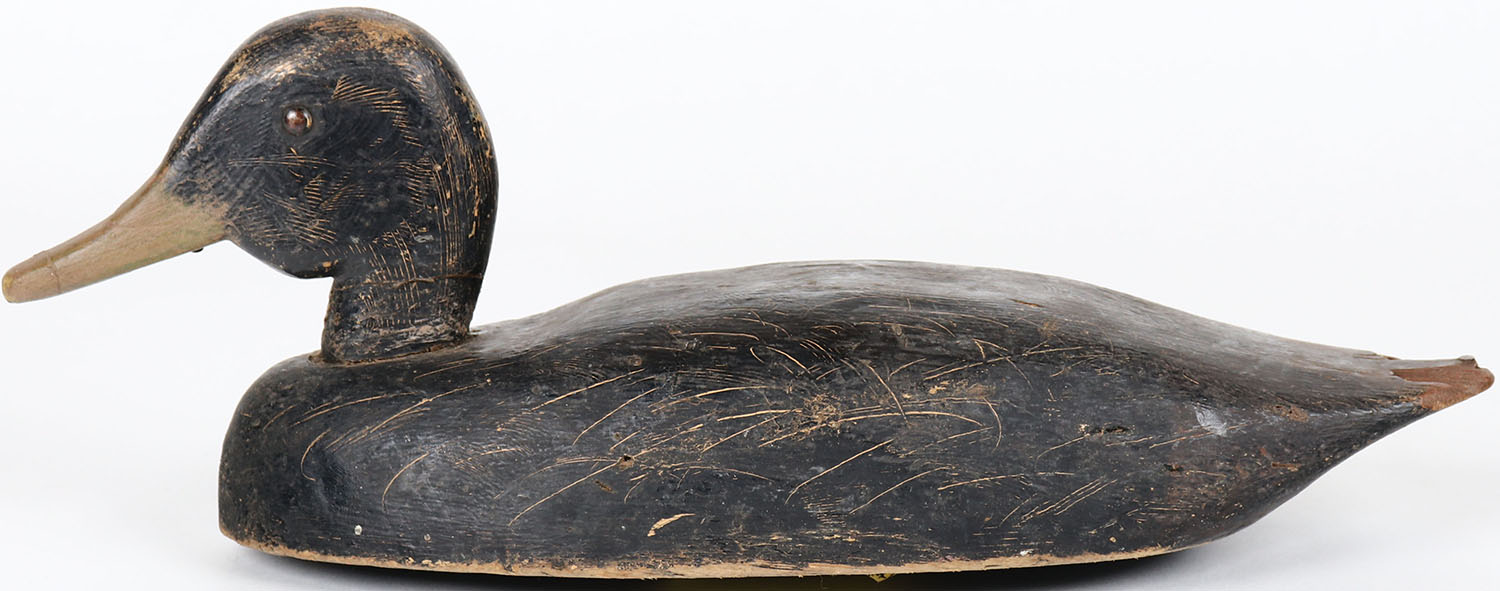 Black Duck by unknown maker, tack eyes, solid wood, structurally excellent, original paint. Grade: Very Good ++ - Value: 40 to 80