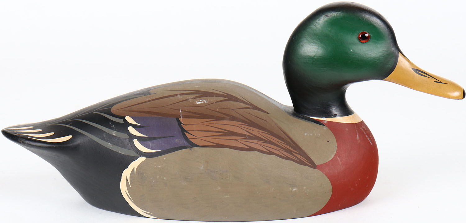 Mallard Drake by Raymond S Howard, Hornkick Bros. Stoney Point Decoys Oak Hall, Virginia, glass eyes, solid wood, structurally excellent, branded M on bottom, original paint. Grade: MINT - Value: 40 to 80