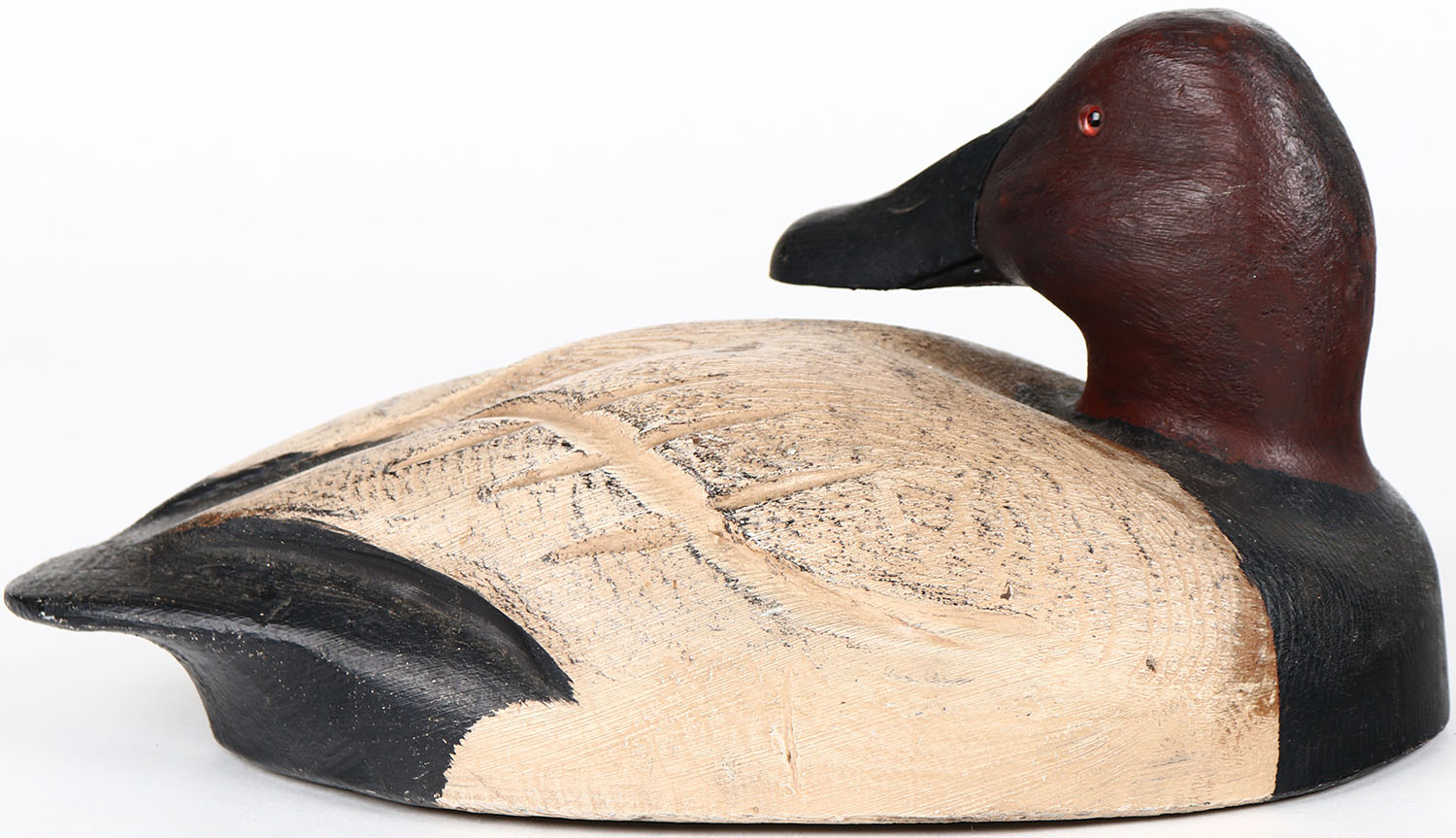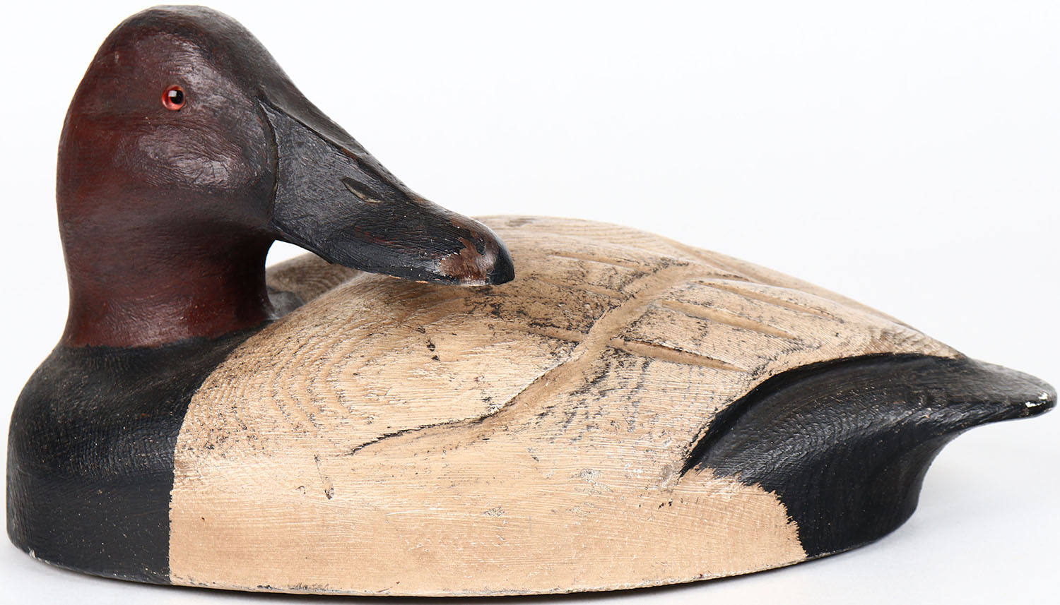 Preening Canvasback Drake by unknown maker, glass eyes, solid wood, structurally excellent, original paint. Grade: Excellent ++ - Value: 30 to 200