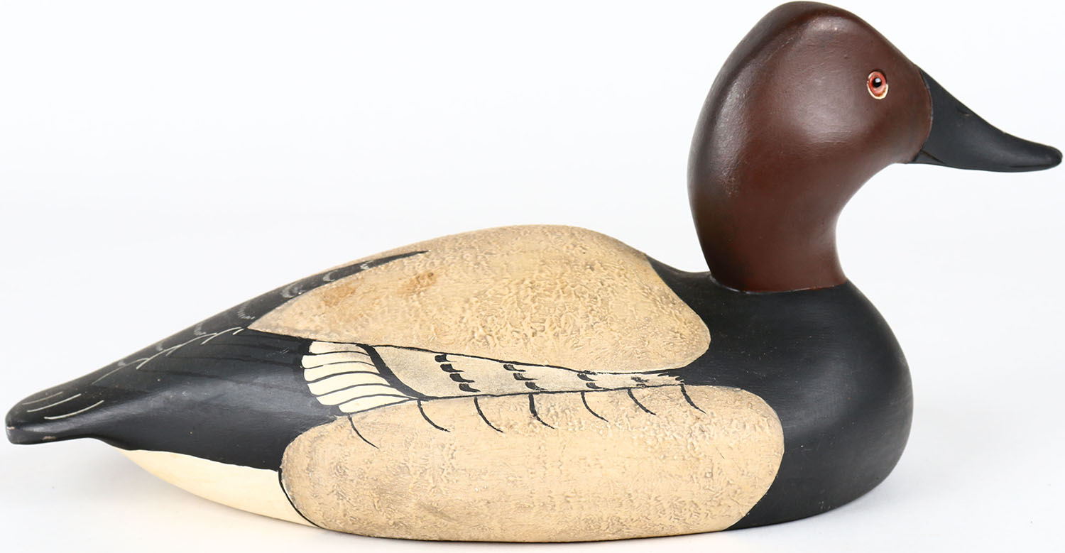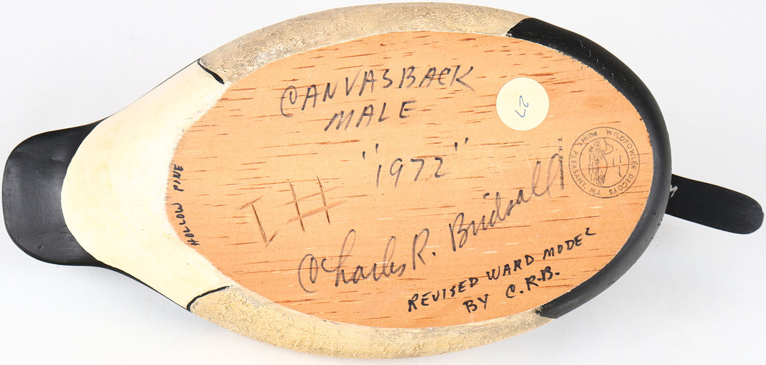 Canvasback Drake by Charles R. Birdsall, Wildfowler Decoys, Point Pleasant, N.J. glass eyes, hollow wood, structurally excellent, branded and signed on bottom, original paint. Grade: MINT - Value: 50 to 100