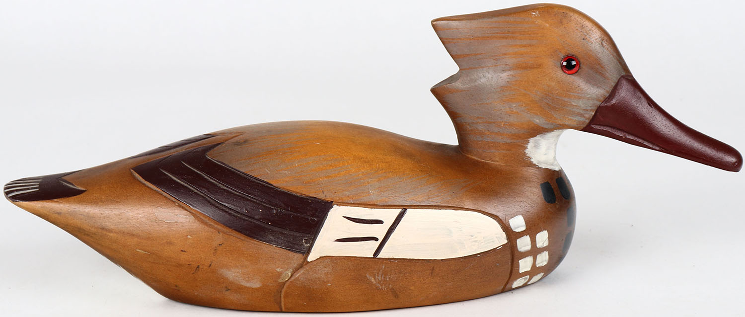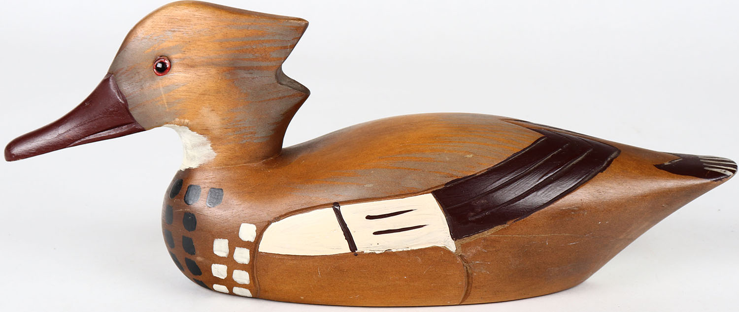 Hooded Merganser Hen by unknown maker, glass eyes, solid wood, structurally excellent, original paint. Grade: MINT - Value: 30 to 60