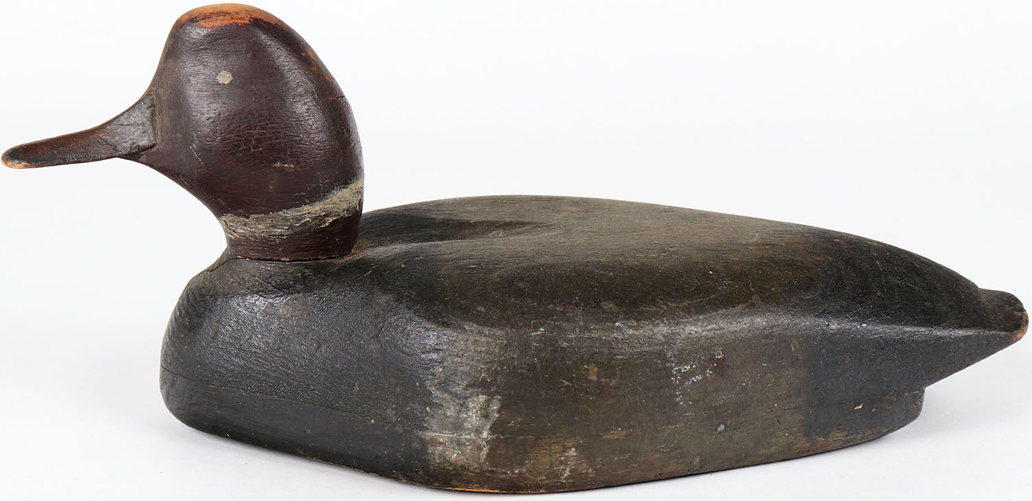 Redhead Drake by unknown maker, painted eyes, hollow wood, head is loose, repainted. Grade: Very Good + - Value: 50 to 100