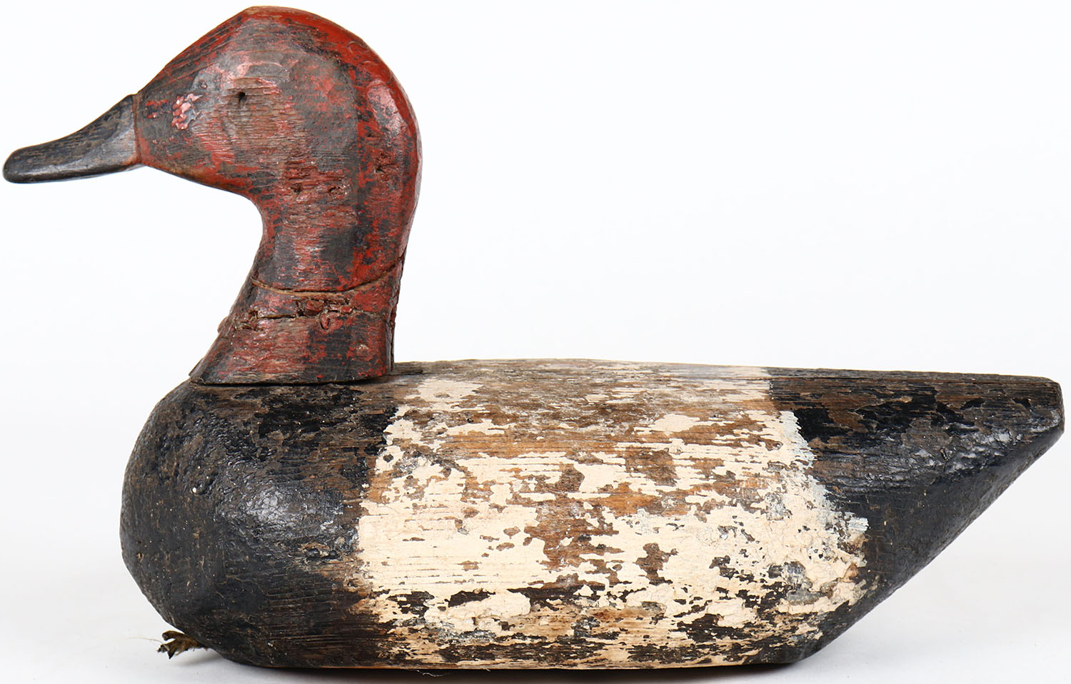 Canvasback Drake by unknown maker, no eyes, solid wood, structurally excellent, original paint. Grade: Very Good + - Value: 50 to 100