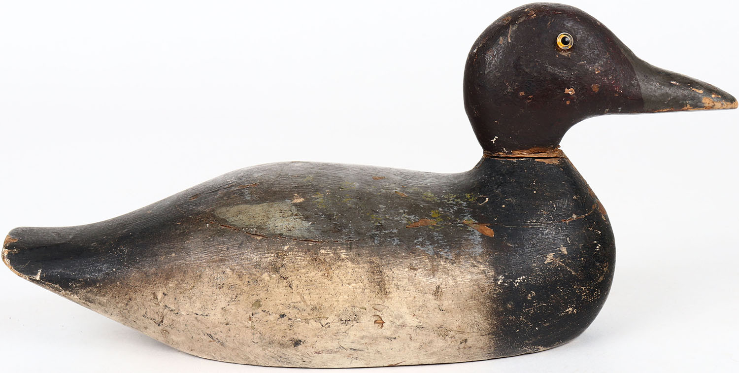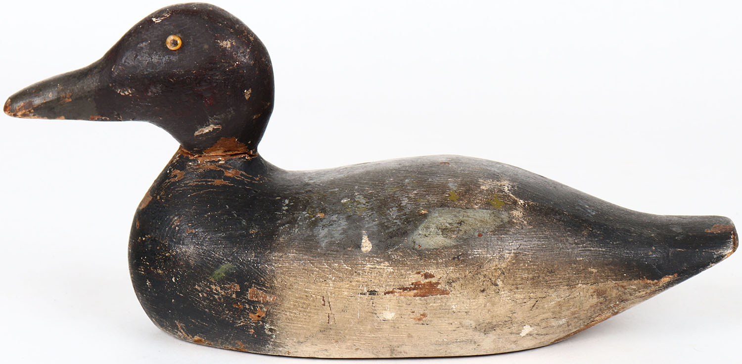 Bluebill or Redhead Drake by unknown maker, glass eyes, solid wood, head is loose, original paint. Grade: Very Good ++ - Value: 30 to 60
