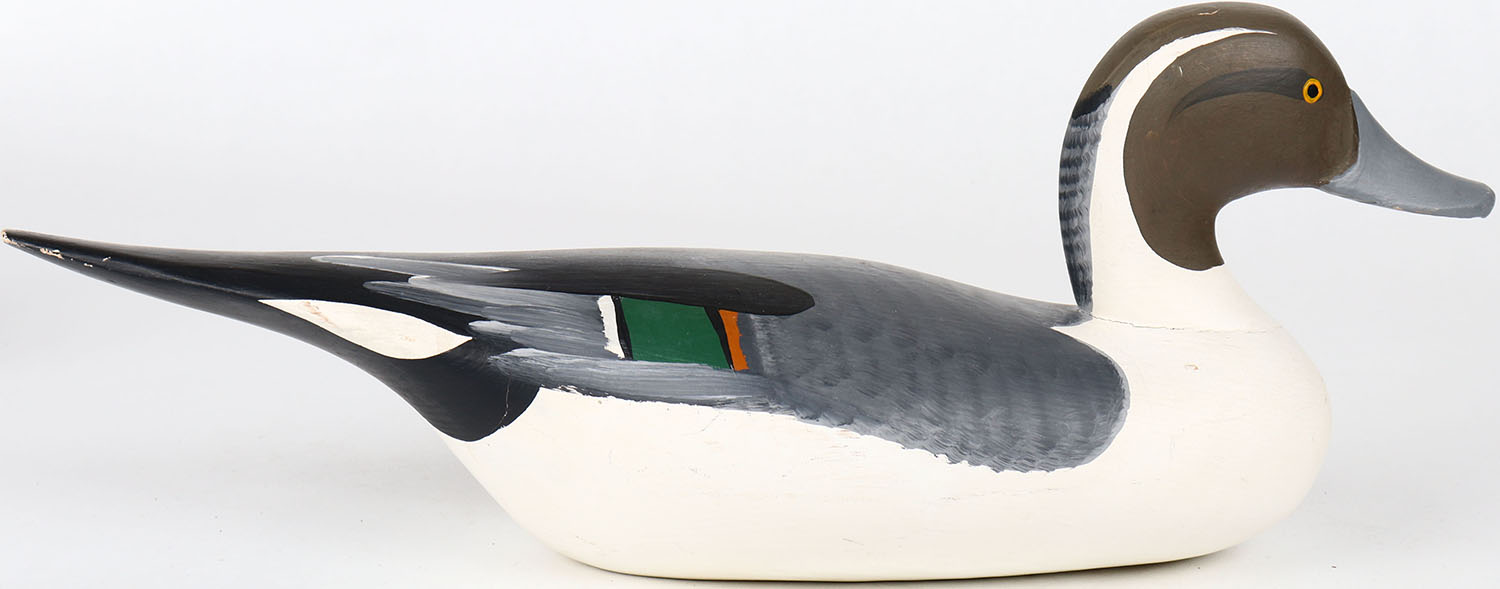 Pintail Drake by Madison Mitchell, painted eyes, solid wood, has age crack around neck, signed on bottom, original paint. Grade: Very Good ++ - Value: 150 to 300