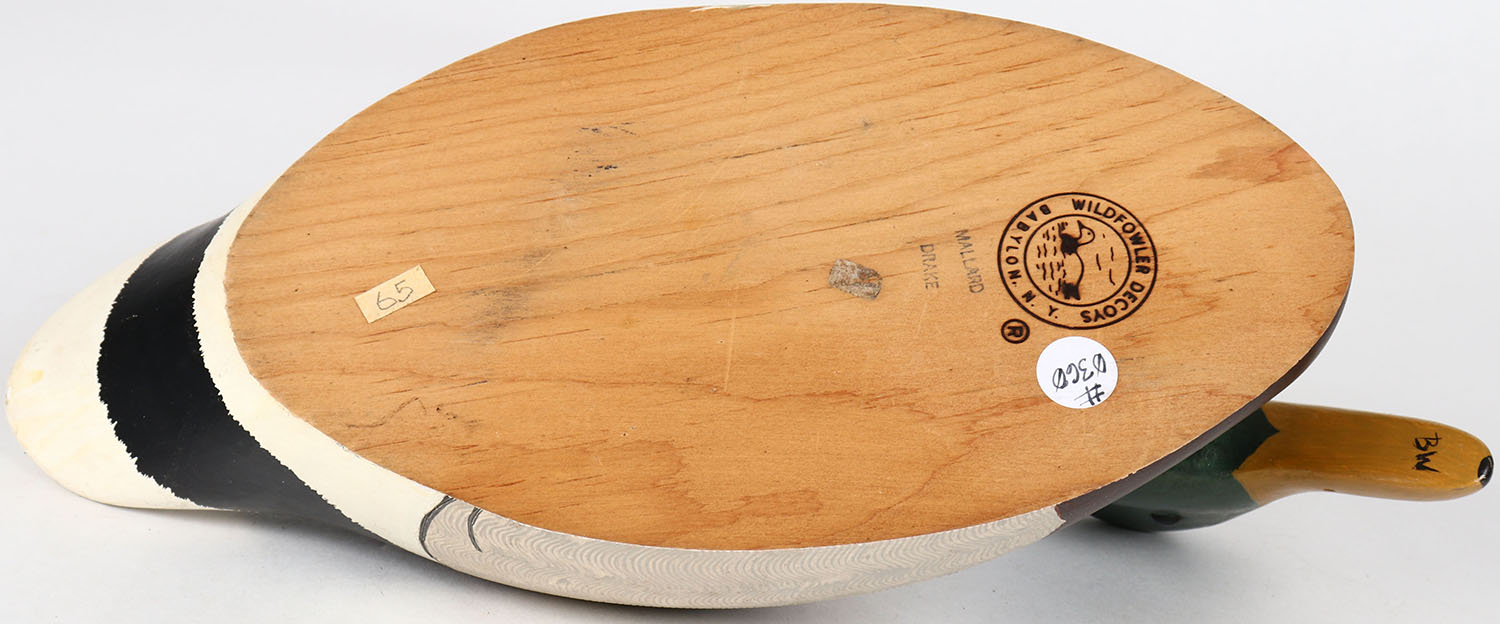 Mallard Drake by Wildfowler Decoys Babylon, N.Y. glass eyes, solid wood, structurally excellent, branded by WILDFOWLER DECOYS on bottom, original paint with comb painting. Grade: MINT - Value: 60 to 150
