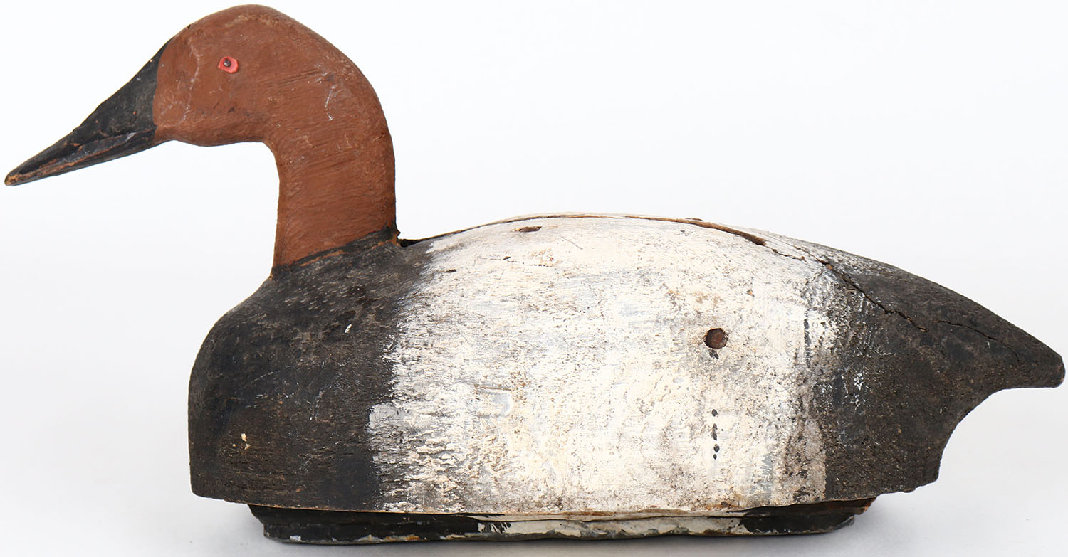 Canvasback Drake by unknown maker, Lk Poygan, Wolf River WI, nailed eyes, solid wood, has age cracks on body, head is loose, original paint. Grade: Very Good + - Value: 30 to 60