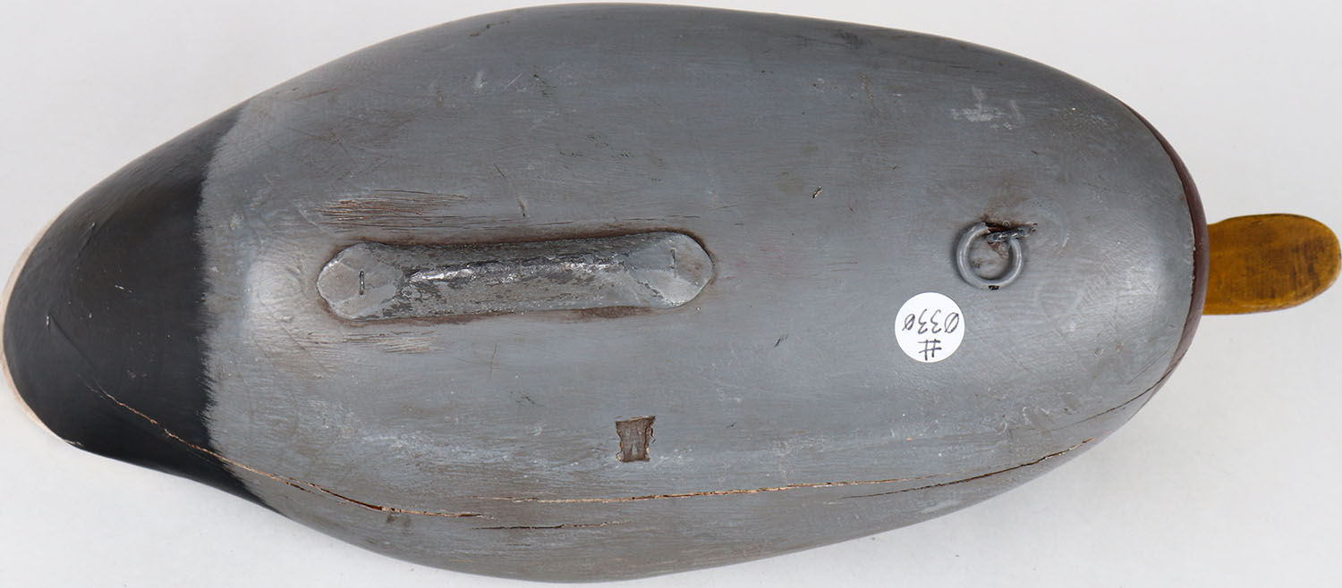 Mallard Drake by Harry Jobes, Harve De Grace, MD. painted eyes, solid wood, has age cracks on bottom, signed on bottom, repainted. Grade: Very Good ++ - Value: 60 to 150
