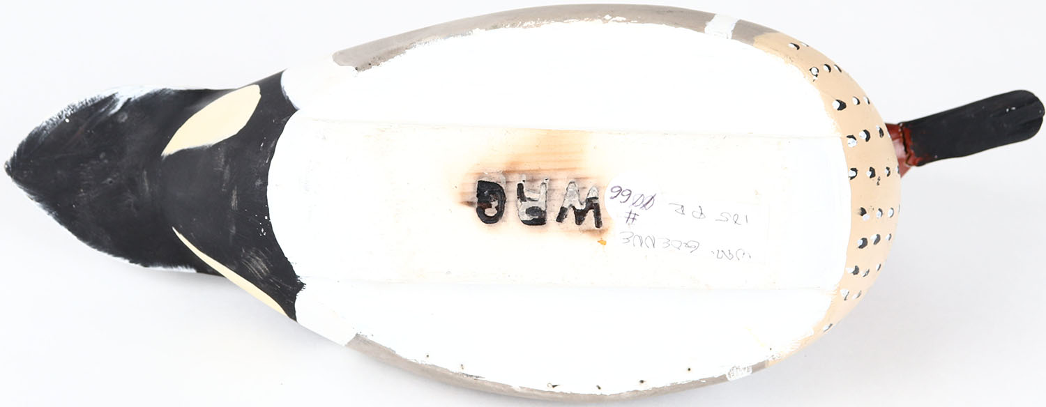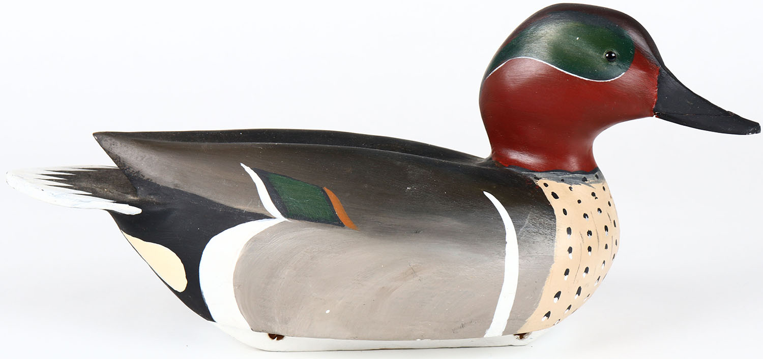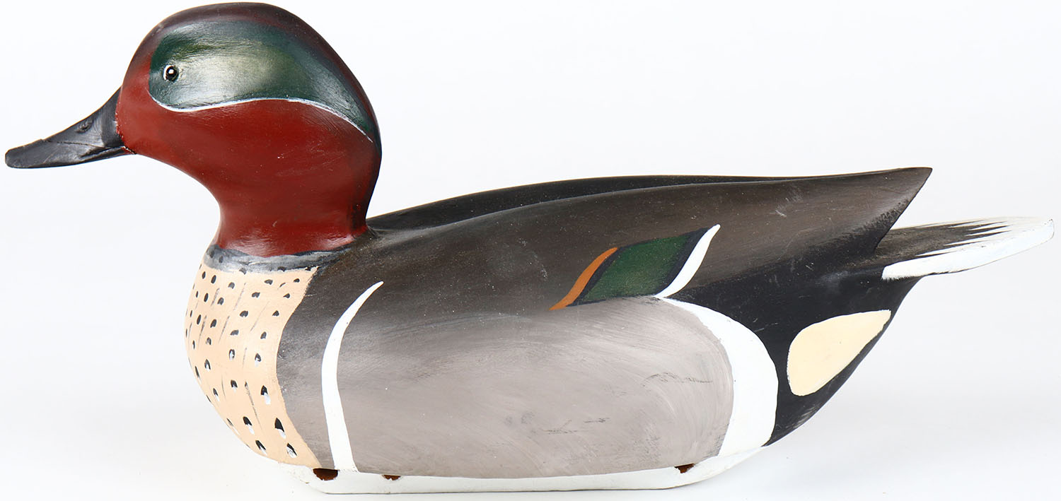 Green Wing Teal Drake by William Goenne, King City, CA,, glass eyes, solid wood, bill is cracked, signed and branded on bottom, original paint. Grade: Very Good ++ - Value: 70 to 200