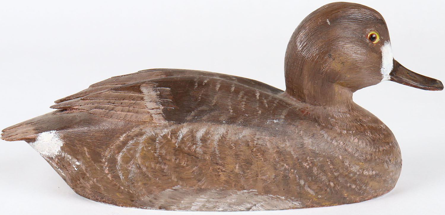 Bluebill Hen by unknown maker, glass eyes, hollow wood, structurally excellent, original paint. Grade: MINT - Value: 70 to 200