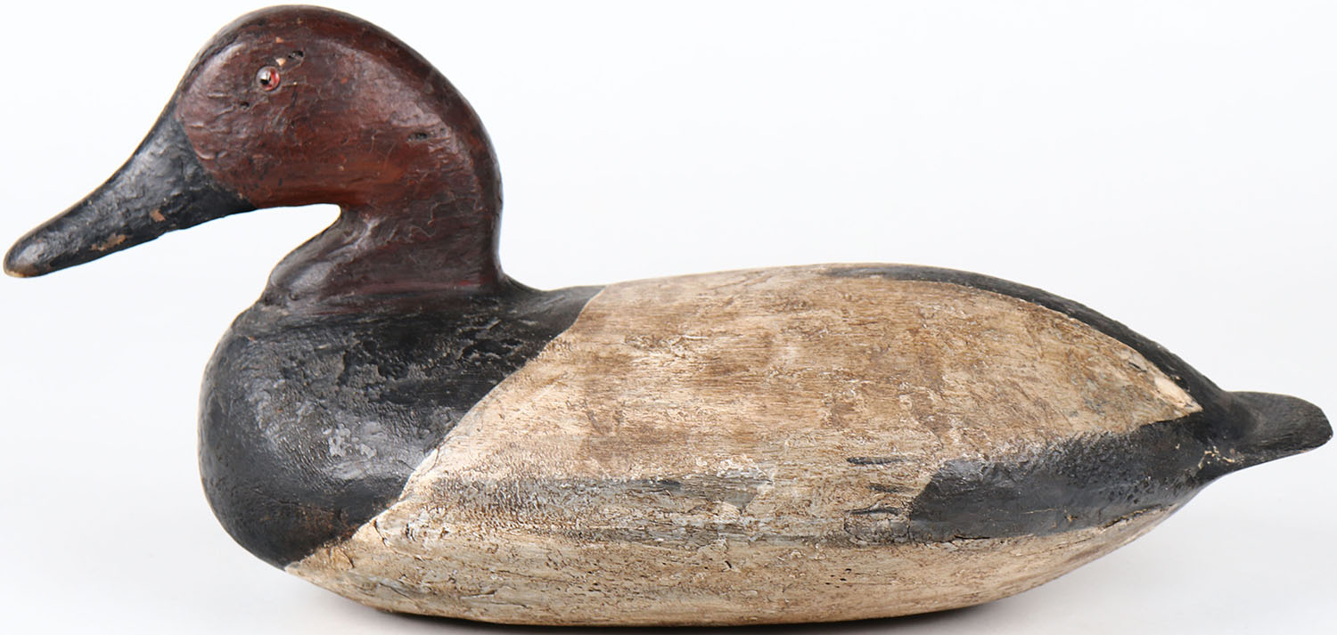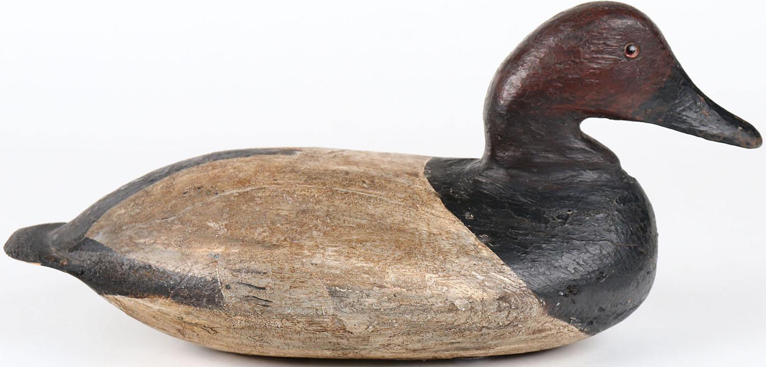 Canvasback Drake by unknown maker, glass eyes, structurally excellent, solid wood, repainted. Grade: Very Good ++ - Value: 70 to 300