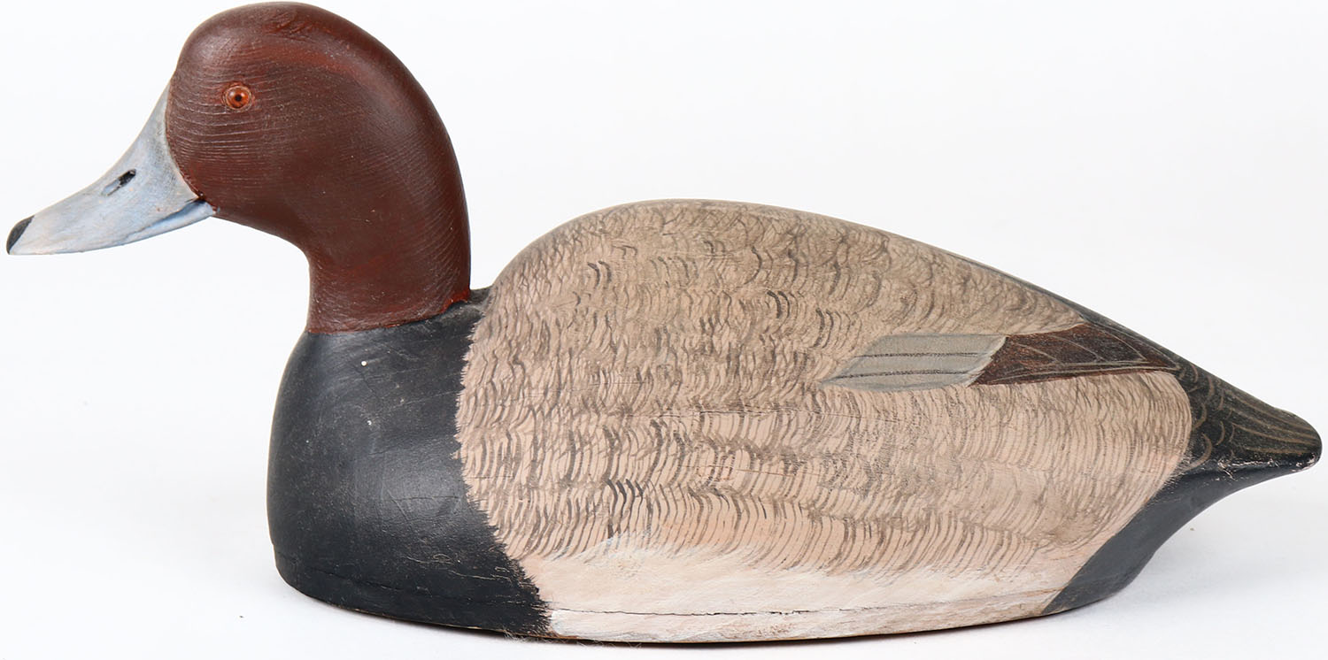 Redhead Drake by Len Carnagi, St. Clair Flats MI, painted eyes, has age crack on bottom, hollow wood, signed and branded on bottom, repainted. Grade: Very Good ++ - Value: 50 to 100