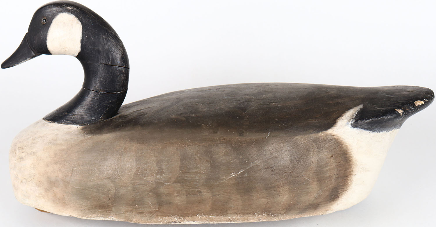 Canada Goose by Wildfowler Decoys Inc. Old Saybrook CT, glass eyes, head is cracked, solid wood, branded by WILDFOWLER DECOYS on bottom, original paint. Grade: Very Good ++ - Value: 100 to 200