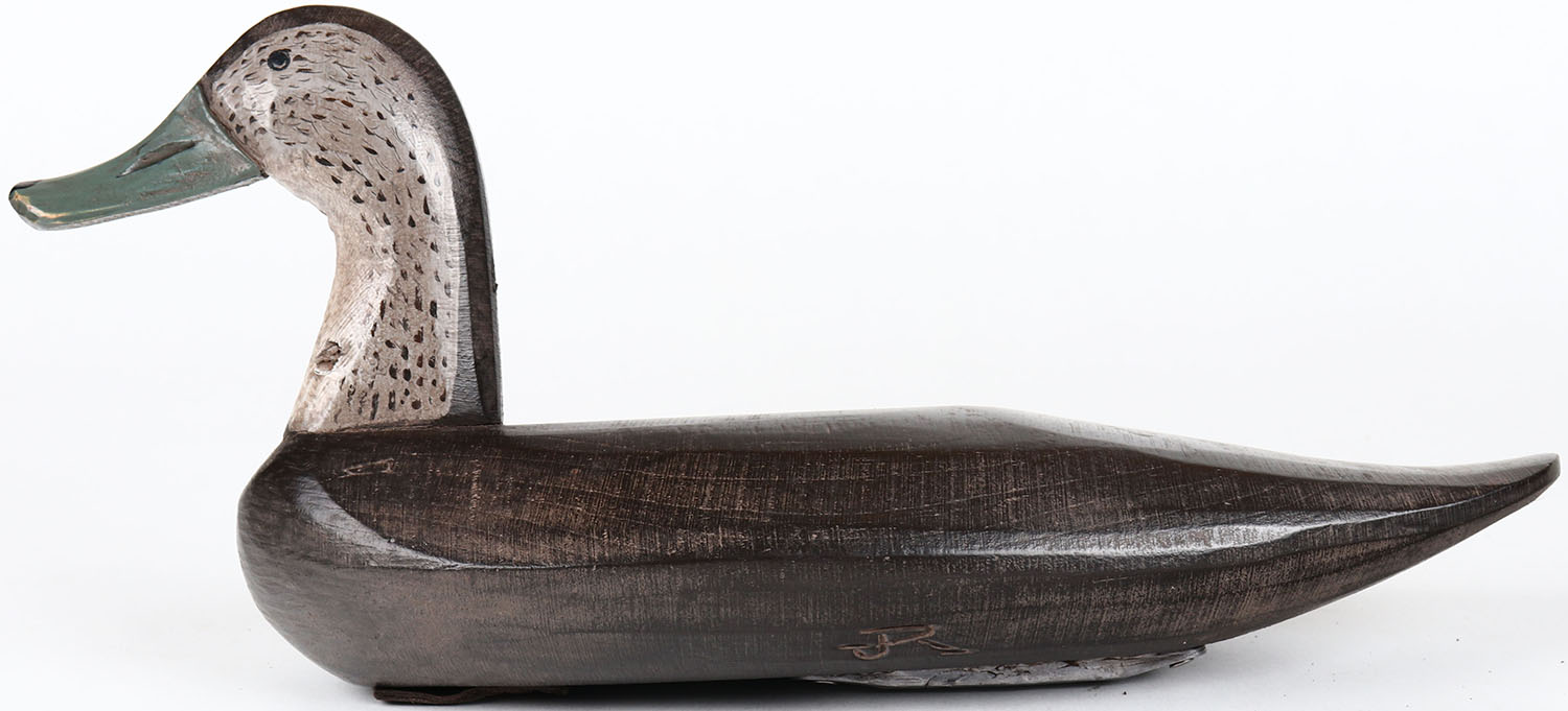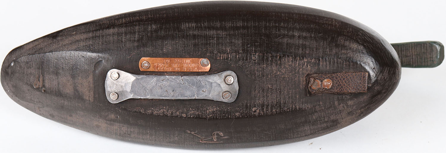 Black Duck by Joe Racine, Upper Bay Decoys, Elkton, MD, painted eyes, structurally excellent, solid wood, branded on bottom, original paint. Grade: MINT - Value: 60 to 150