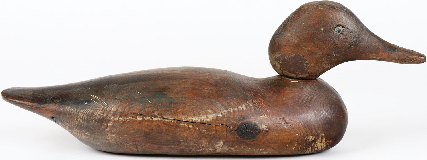 Mallard by Mason Decoy Company, Detroit, MI, tack eyes, has age cracks on back and bottom, head is loose, solid wood, signed on bottom, original paint. Grade: MINT - Value: 30 to 60