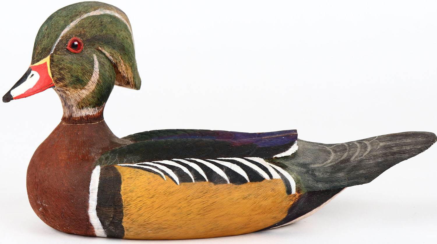 Wood Duck Drake by Keith Hamer, glass eyes, neck has age crack, solid wood, signed on bottom, original paint. Grade: Very Good ++ - Value: 40 to 80
