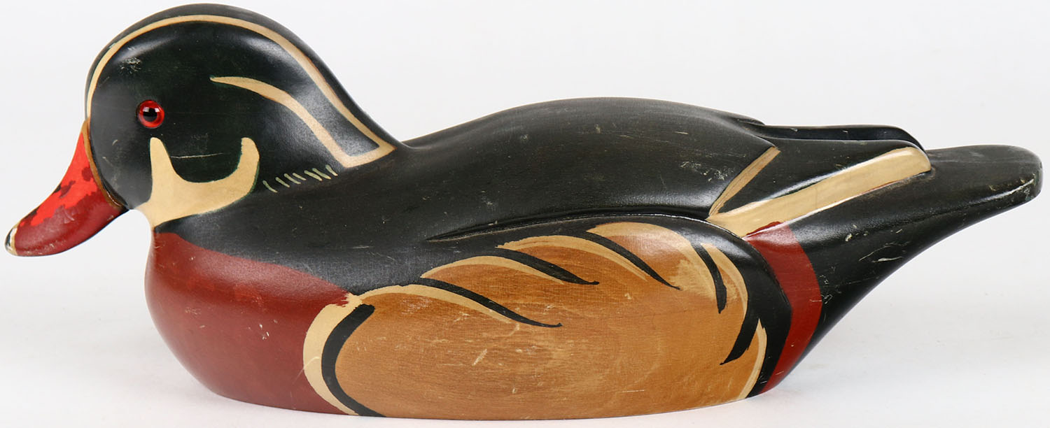 Wood Duck Drake by Ron Fisher, glass eyes, structurally excellent, solid wood, original paint. Grade: Excellent - Value: 40 to 80