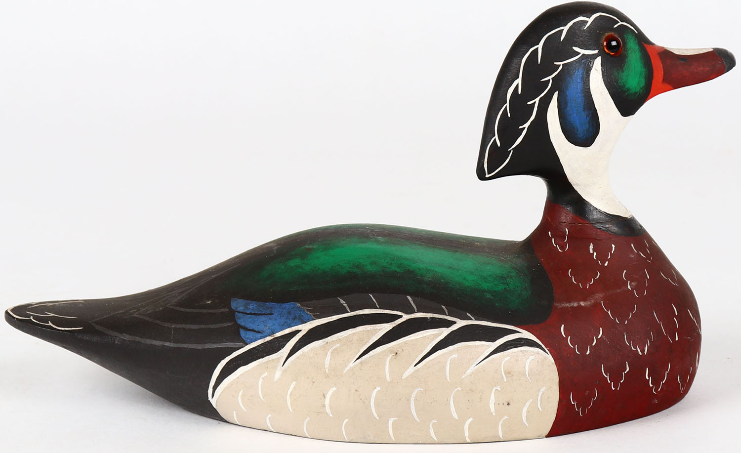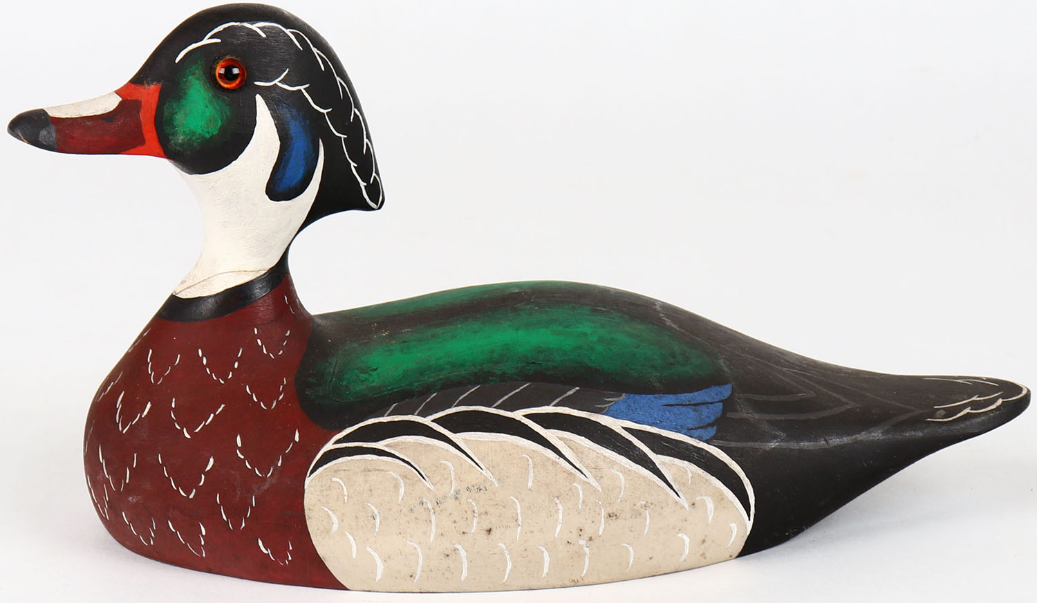 Wood Duck Drake by Barb, glass eyes, structurally excellent, solid wood, signed on bottom, original paint. Grade: MINT - Value: 40 to 80