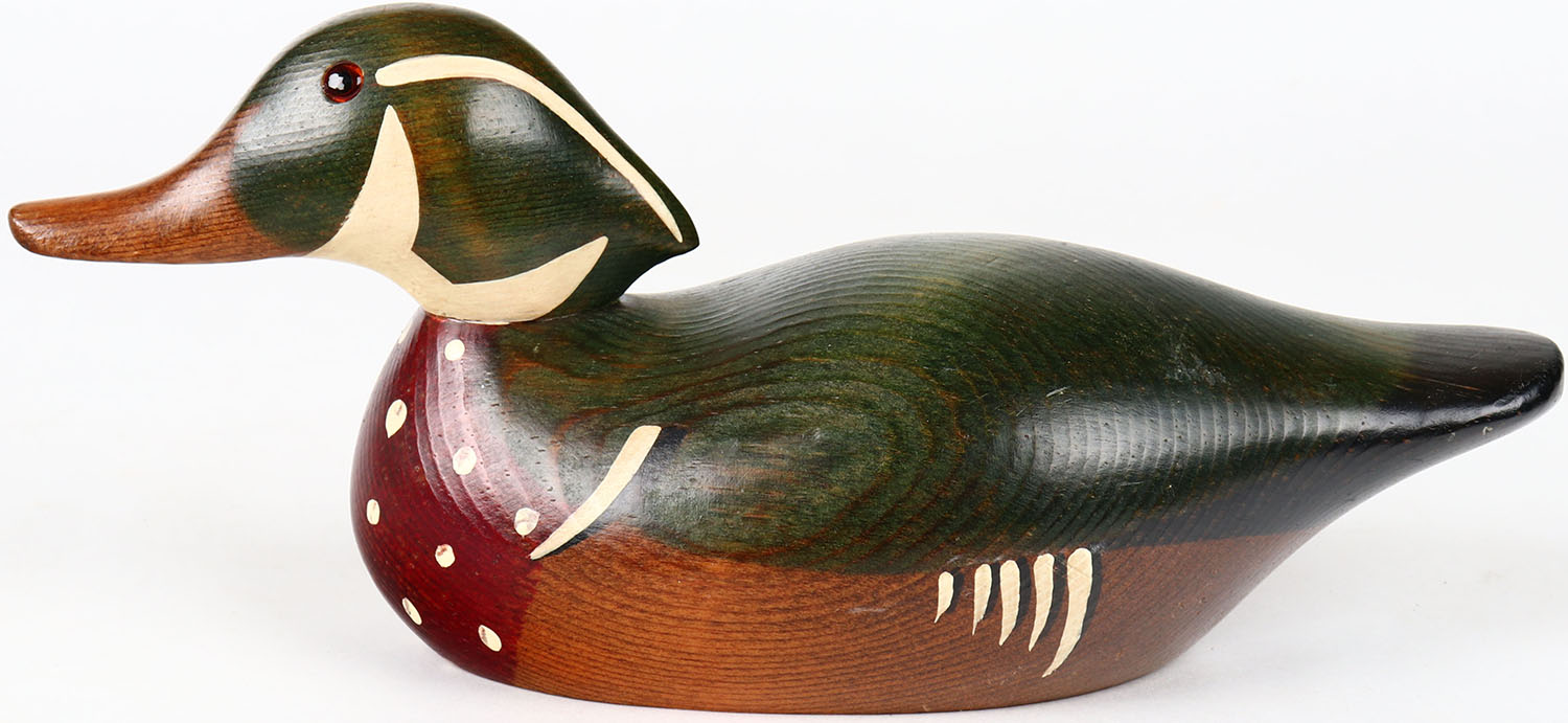 Wood Duck Drake by Frank L. Blall, glass eyes, structurally excellent, solid wood, signed on bottom, original paint. Grade: MINT - Value: 30 to 60