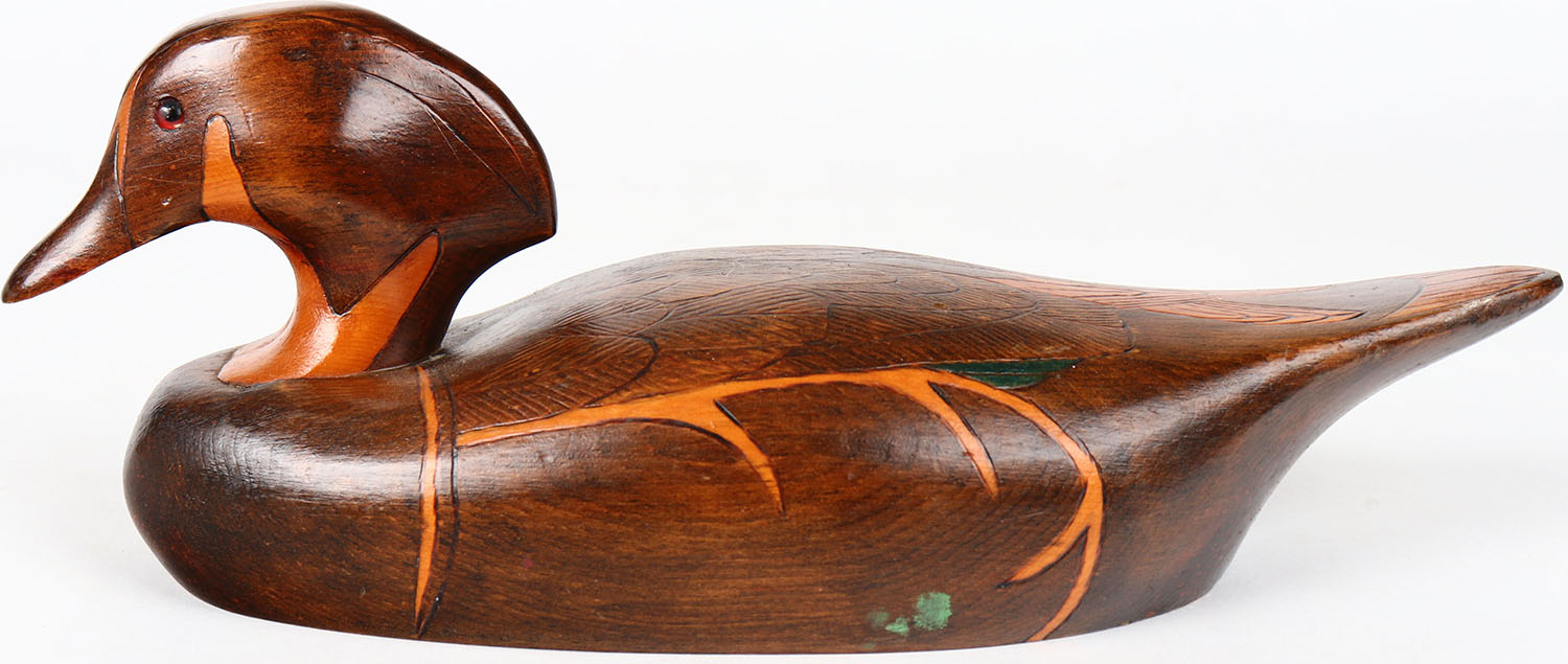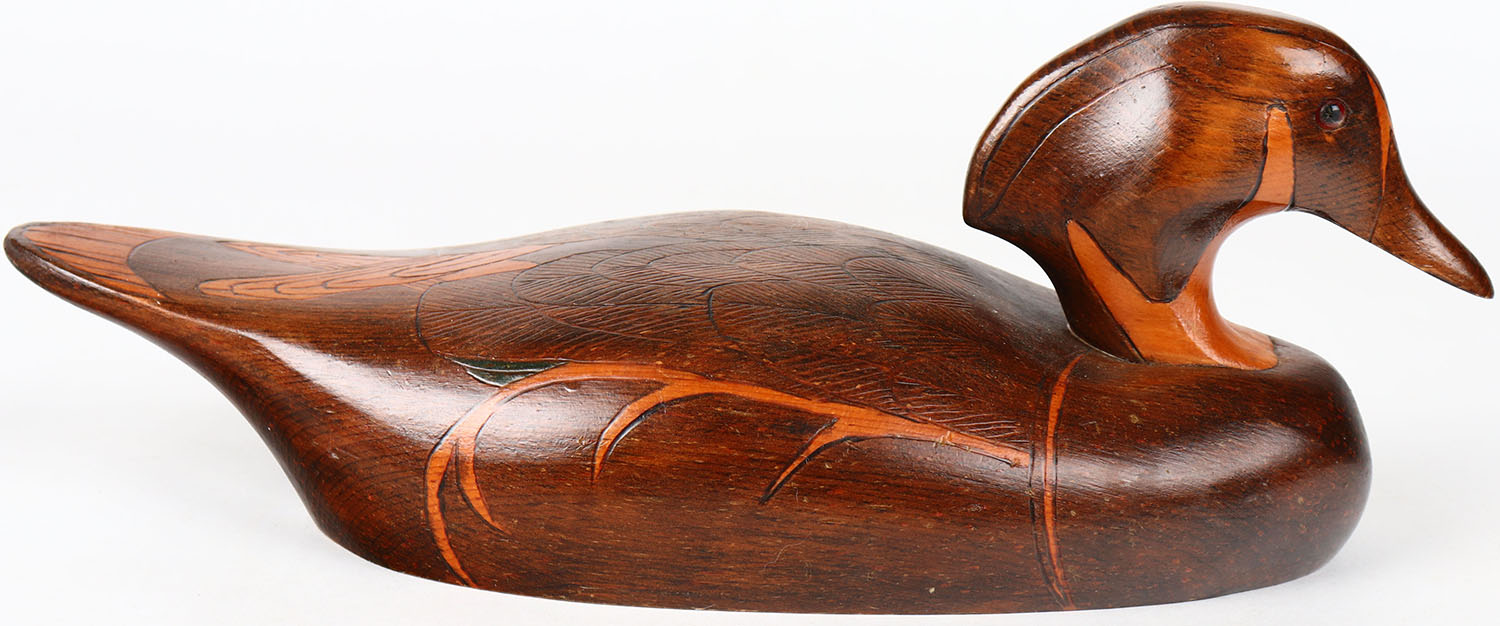 Wood Duck Drake by unknown maker, glass eyes, structurally excellent, solid wood, original paint. Grade: MINT - Value: 30 to 60