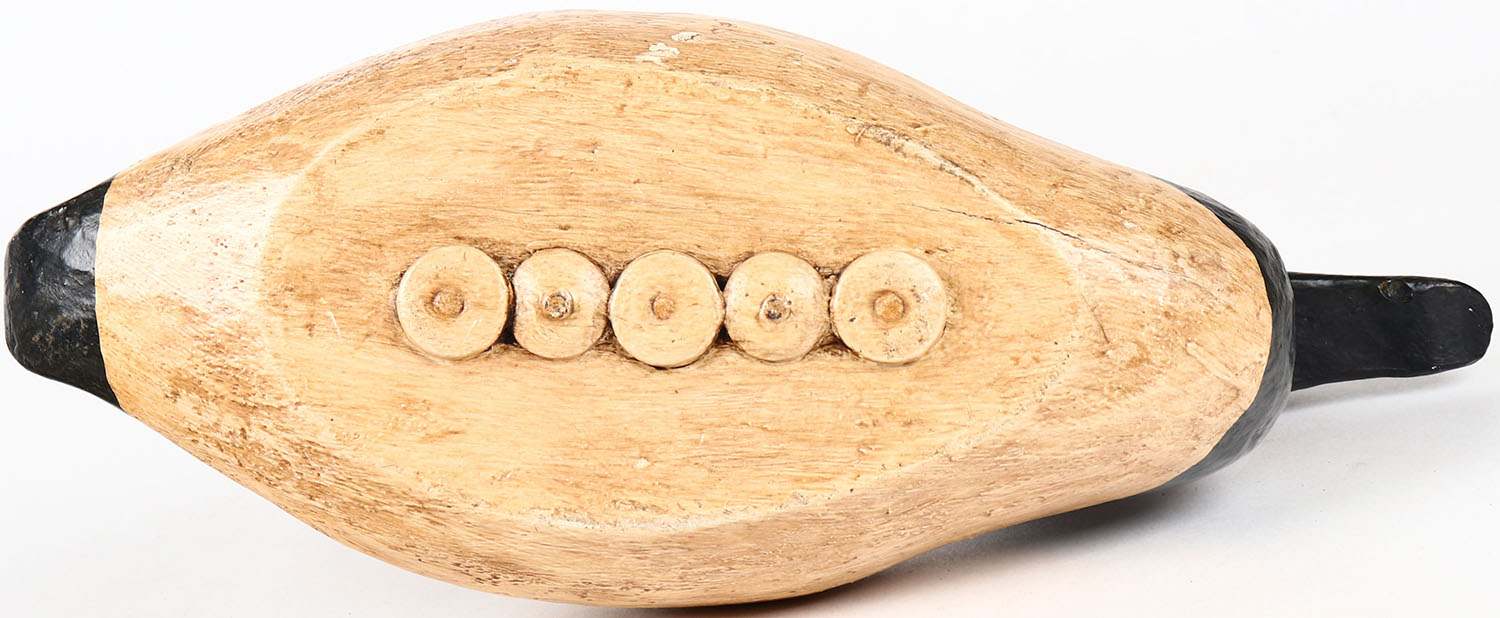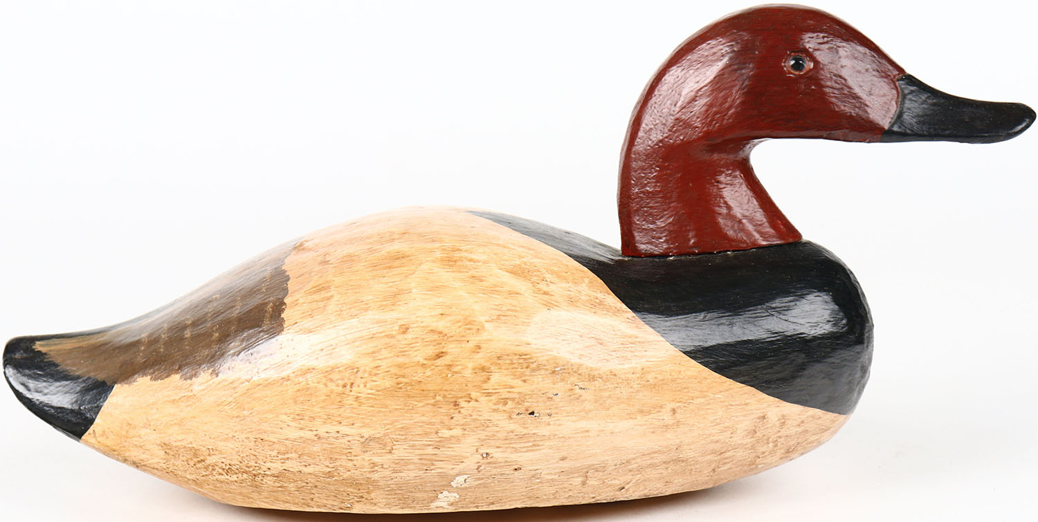 Canvasback Drake by unknown maker, painted eyes, head is loose, solid wood, signed on bottom, repainted. Grade: Very Good ++ - Value: 30 to 60