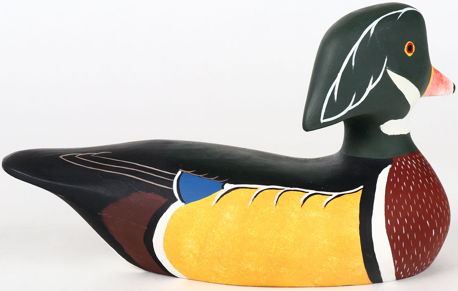 Wood Duck Drake by Linda ?, painted eyes, structurally excellent, solid wood, signed on bottom, original paint. Grade: Excellent ? - Value: 30 to 60