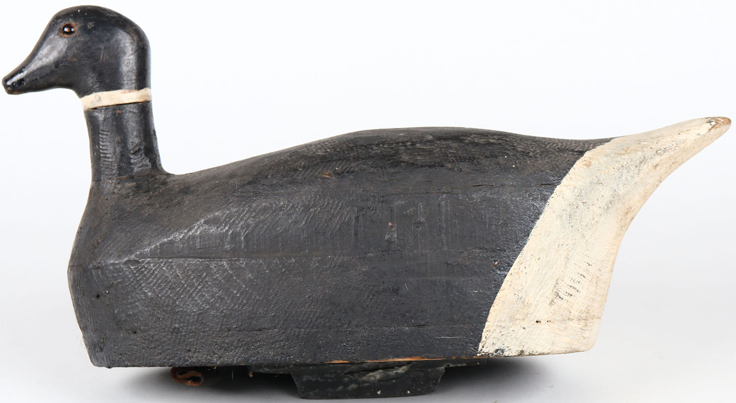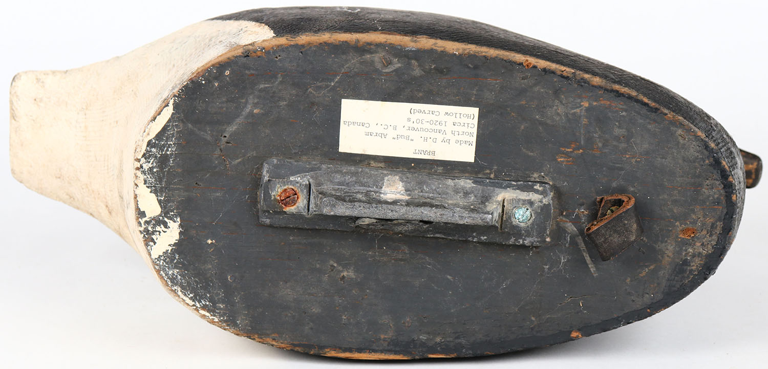 Black Brant by D.H. ''Bud'' Abram, North Vancouver, B.C., Canada, Circa 1920's-30's, glass eyes, hollow wood, head is loose, has age cracks on body, signed on bottom, original paint. Grade: Very Good ++ - Value: 100 to 200