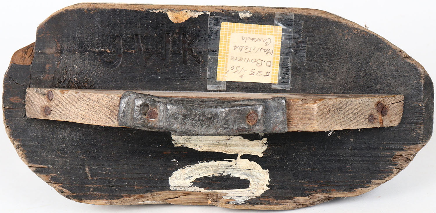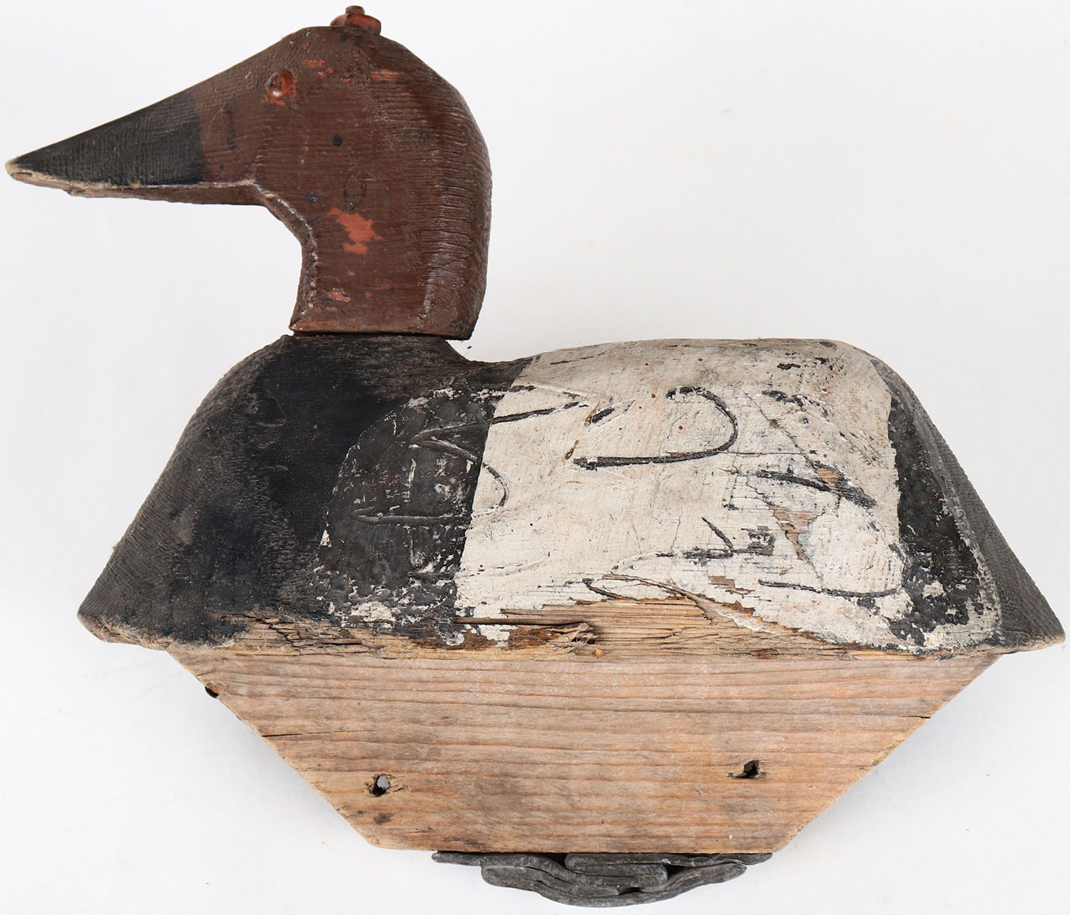 Canvasback Drake by D. Bovier, Manitoba, CAN, tack eyes, solid wood, has age cracks on body, bill is broken underneath, signed on bottom, original paint. Grade: Very Good - Value: 20 to 40