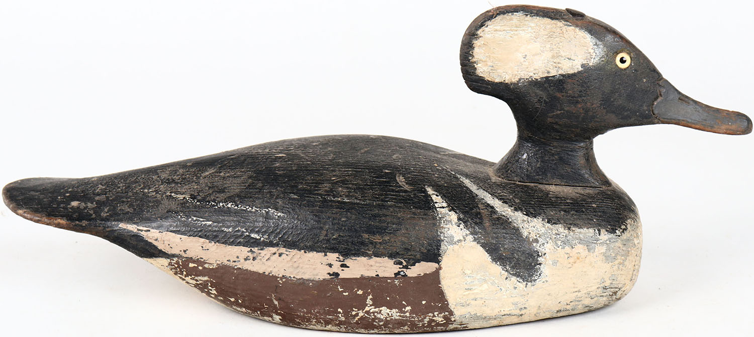 Hooded Merganser Drake by Richardson, glass eyes, solid wood, has age cracks on body, signed on bottom, original paint. Grade: Very Good ++ - Value: 50 to 150