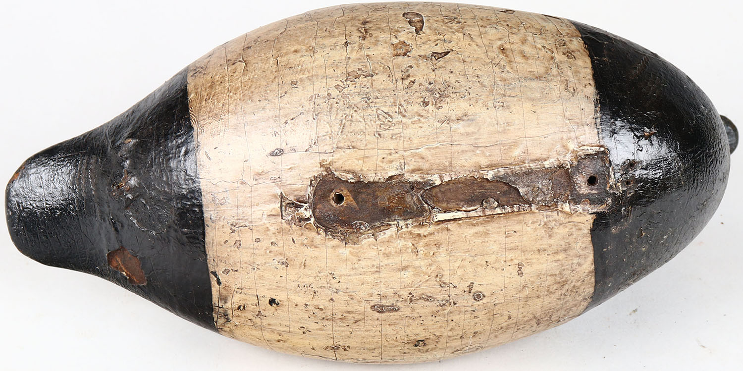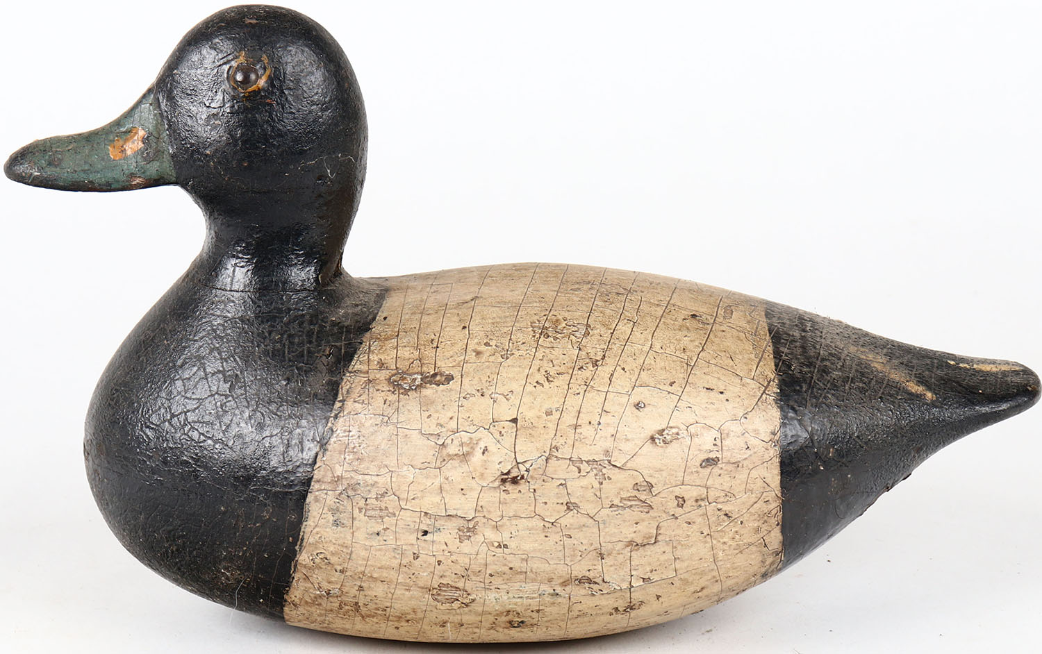Bluebill Drake by unknown maker, IL, tack eyes, hollow wood, has age cracks on entire body, original paint. Grade: Very Good - Value: 100 to 200