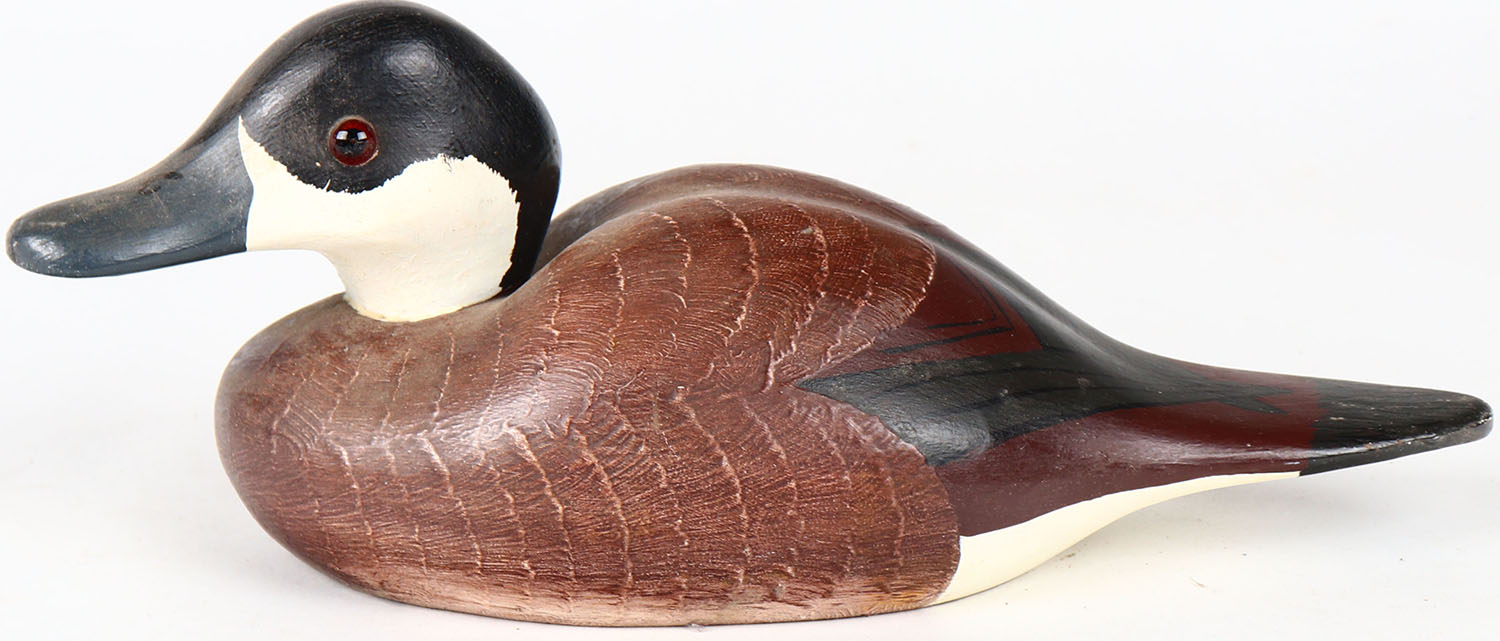 Ruddy Duck Drake by Wildfowler Decoys, Babylon, N.Y, glass eyes, solid wood, structurally excellent, branded on bottom, original paint. Grade: MINT - Value: 30 to 150
