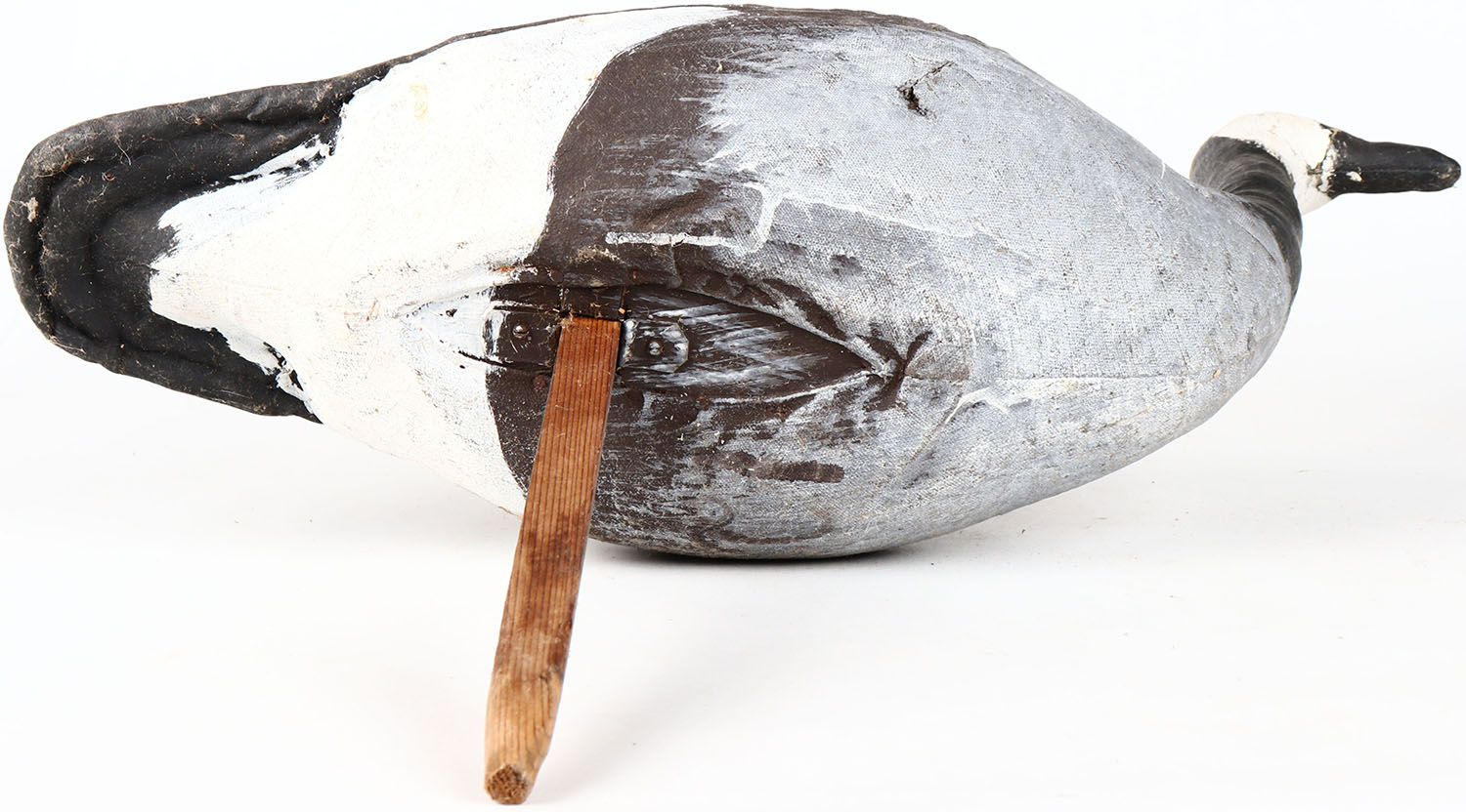 Canada Goose by unknown maker, has wooden stake, canvas over cork, no eyes, original paint. Grade: Excellent - Value: 30 to 100