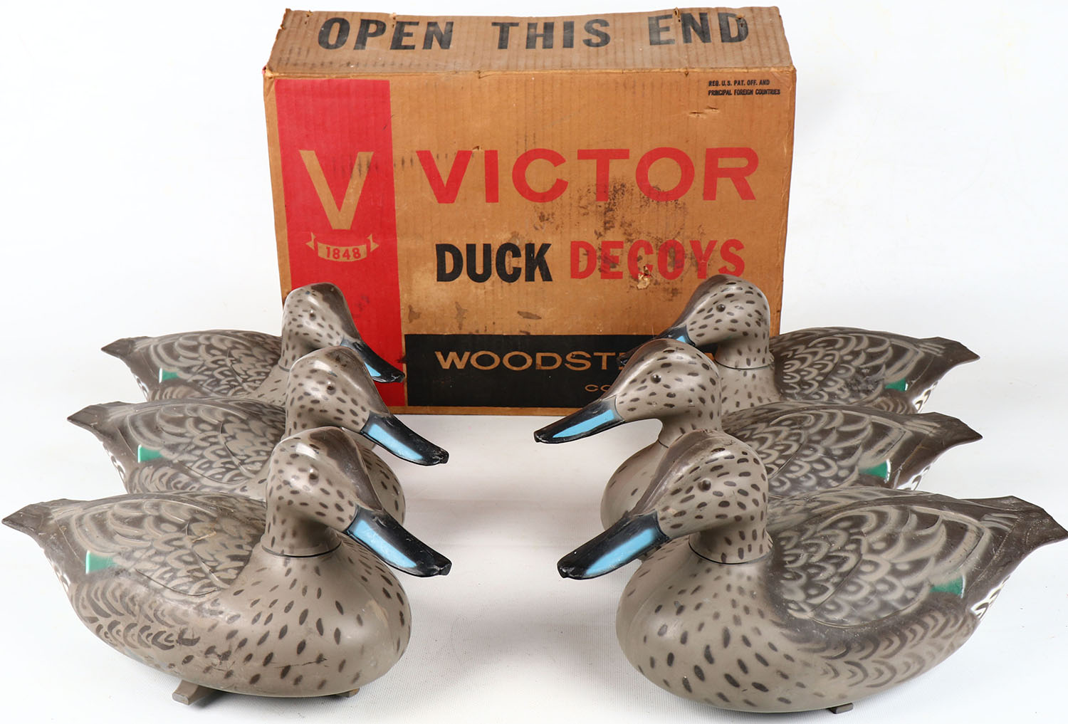 Full Case of 6 Pintail Ducks by Victor Animal Trap Co. Lititz, PA, in the original box, Model D-9, 3 Drakes & 3 Hens, rare to find the original box. Grade: MINT - Value: 40 to 150