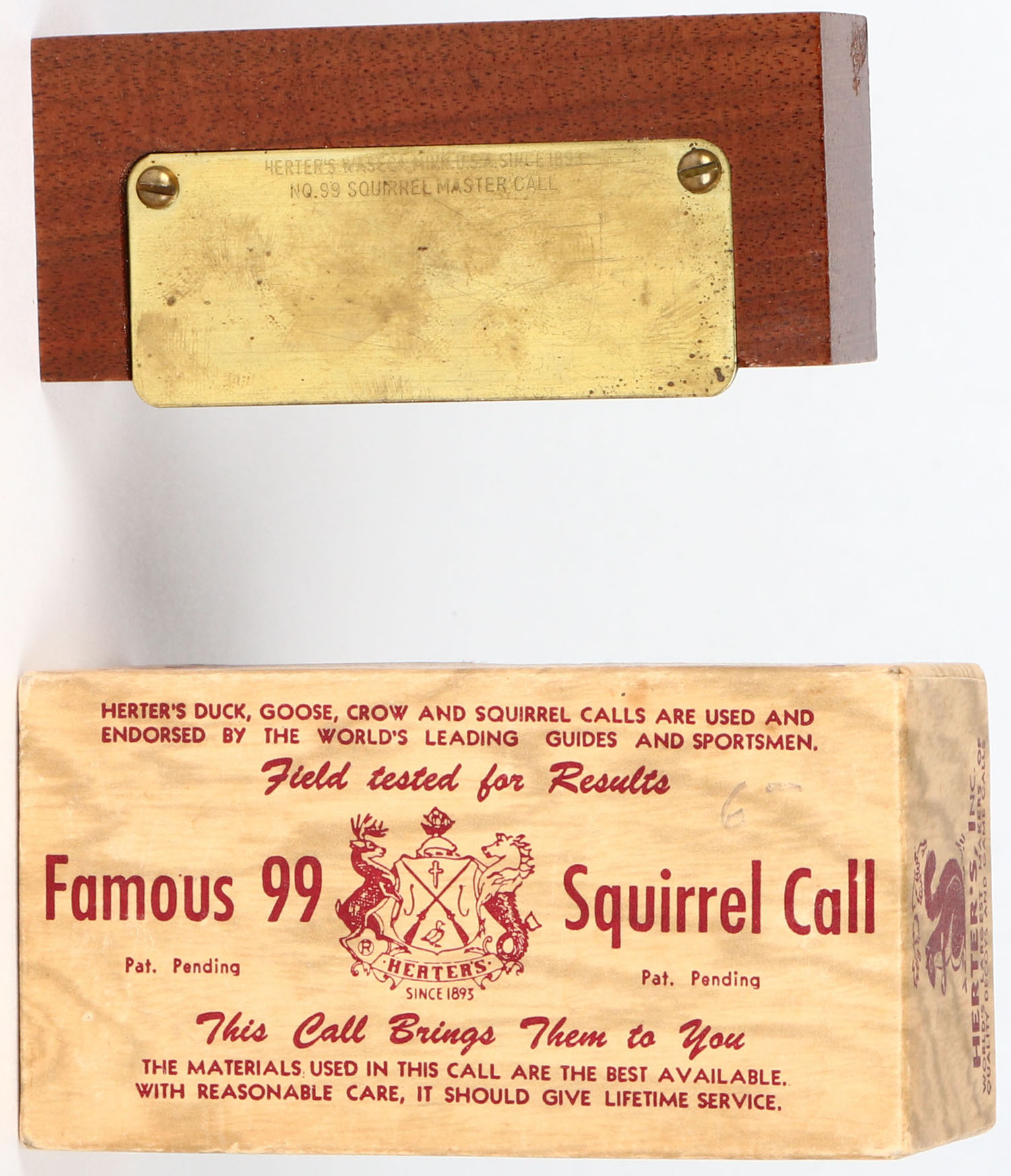 Herters Squirrel Call. Later style Model No. C99 and Striker. Box & Instructions, Lodermeier Collection. Grade: Excellent + - Value: 20 to 60